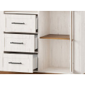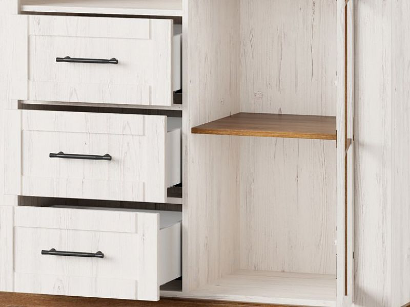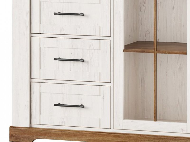 ROVEN je nadčasový a designově velmi povedený systémový nábytek. Bude slušet obývacímu pokoji i jídelně. Je vyroben z foliované dřevotřísky v barevném provedení bílá borovice andersen / dub stirling. U prosklených částí je použito tvrzené bezpečnostní sklo.