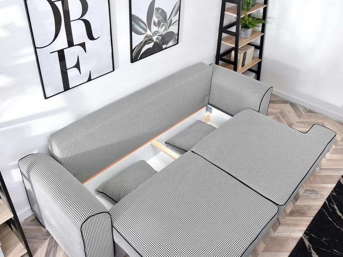 Víceúčelová rozkládací pohovka BIBI s automatickým rozkladem a úložným prostorem, vhodná na příležitostné spaní. Základem sedáku jsou vinuté pružiny a kvalitní PUR pěna, která zajistí pohodlné sezení. Polštáře jsou volně ložené. Nožičky jsou dřevěné. Pohovka BIBI je vybavená velkým úložným prostorem, do kterého lze uschovat ložní prádlo nebo deku s polštářky. Pohovka má očalouněná záda ve stejném potahu jako korpus, je jí možné ustavit do prostoru.