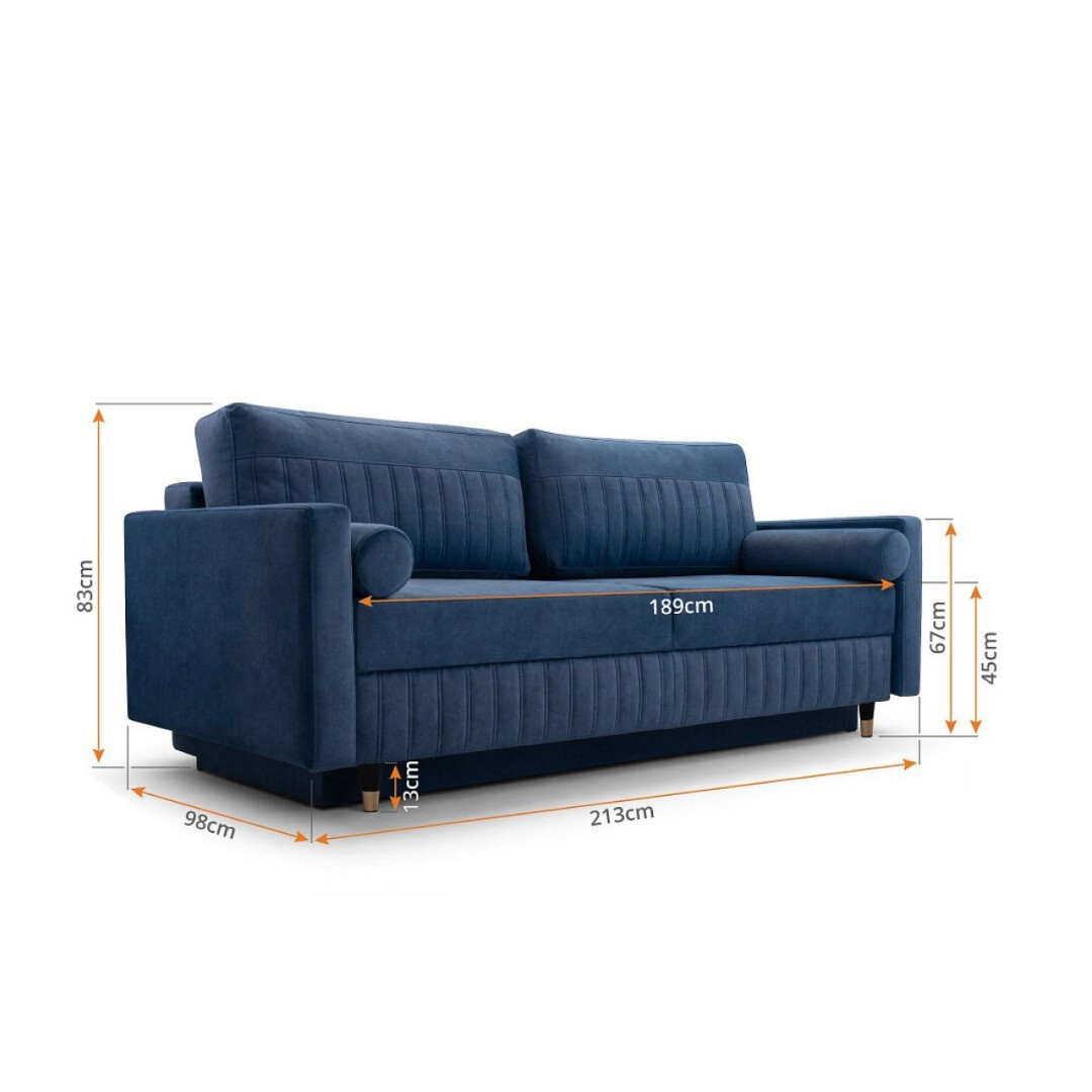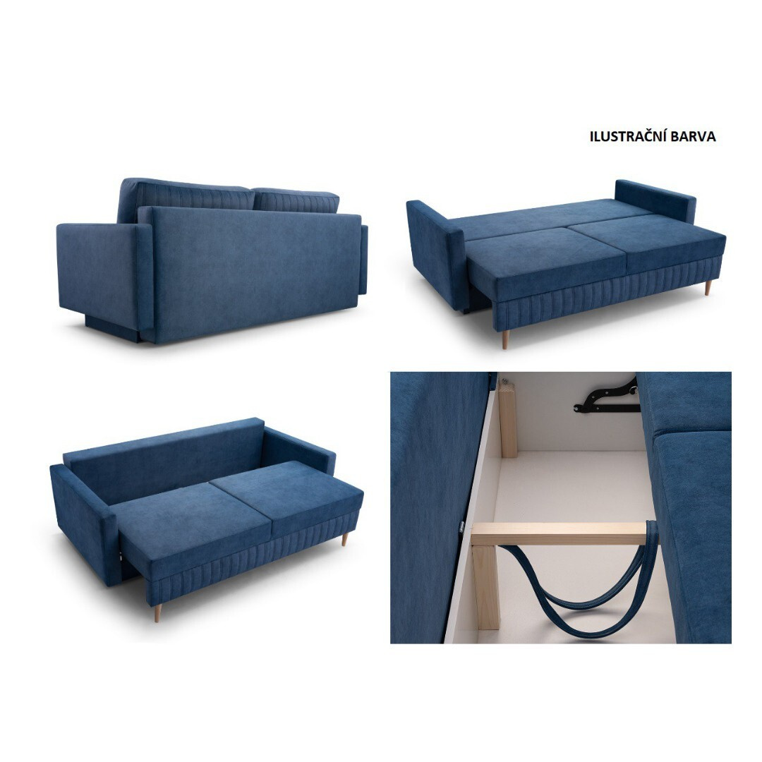 Pohovka BONGO je vhodná na denní spaní. Nabízí totiž možnost rozkladu. Velikost spací plochy je o rozměrech 153 x 189 cm. Rozklad je typu Delfin. Nechybí ani úložný prostor pro uschování sezónních věcí a jiných drobností. Výplň je tvořená bonnelovou a vlnitou pružinou, opěrné polštáře jsou vyplněny silikonovým vláknem. Atraktivitu pohovce dodá designové prošití polštářů a korpusu. Ukotveno na dřevěných nožičkách vysokých 13 cm. Výška sedu je 45 cm.