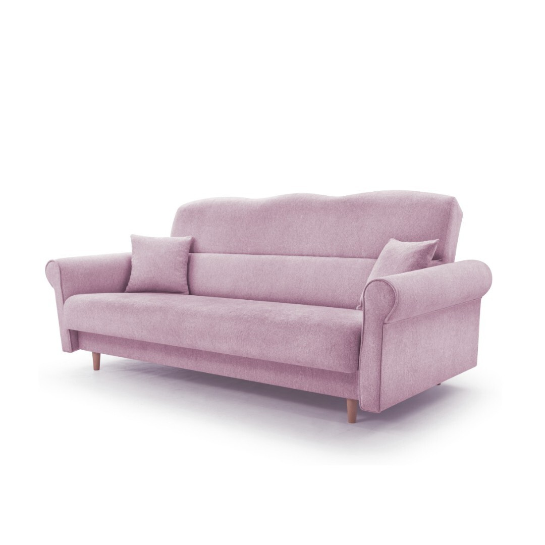 Korpus je vyroben z masivního dřeva a nábytkové desky. Sedák je vyplněn BONELL pružinou o síle 2,4 mm a vysoce pružnou pěnu T 25 o síle 3 cm, díky čemuž je komfort používání pohovky na vysoké úrovni. Pohovka dřevěné - bukové. V ceně zdarma jsou dva dekorační polštářky. Pohovka je potažena látkou ve starorůžovém odstínu, látkou AVRA 10. Očalouněná jsou i záda pohovky, je tedy možné ji umístit do prostoru. Nožičky jsou bukové.