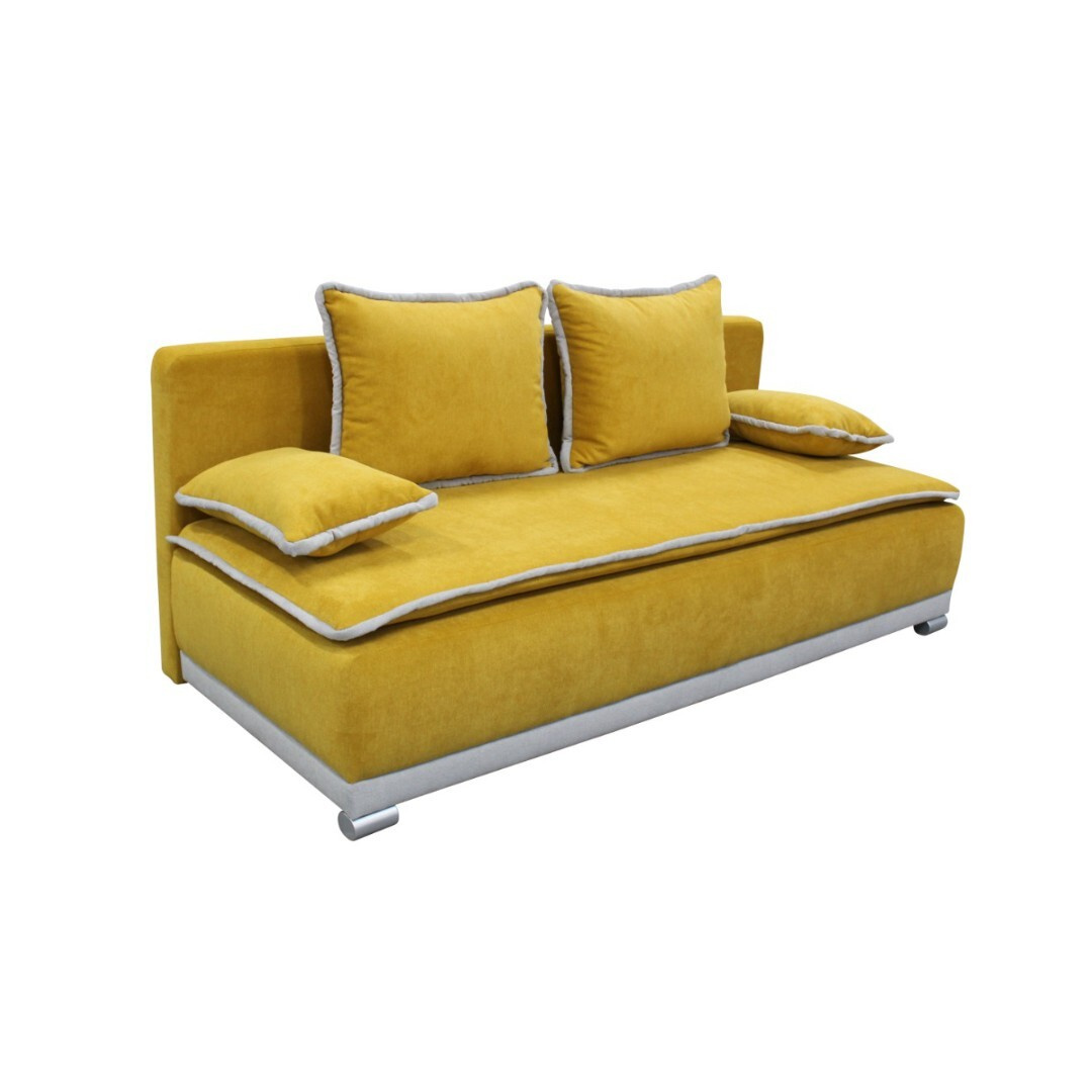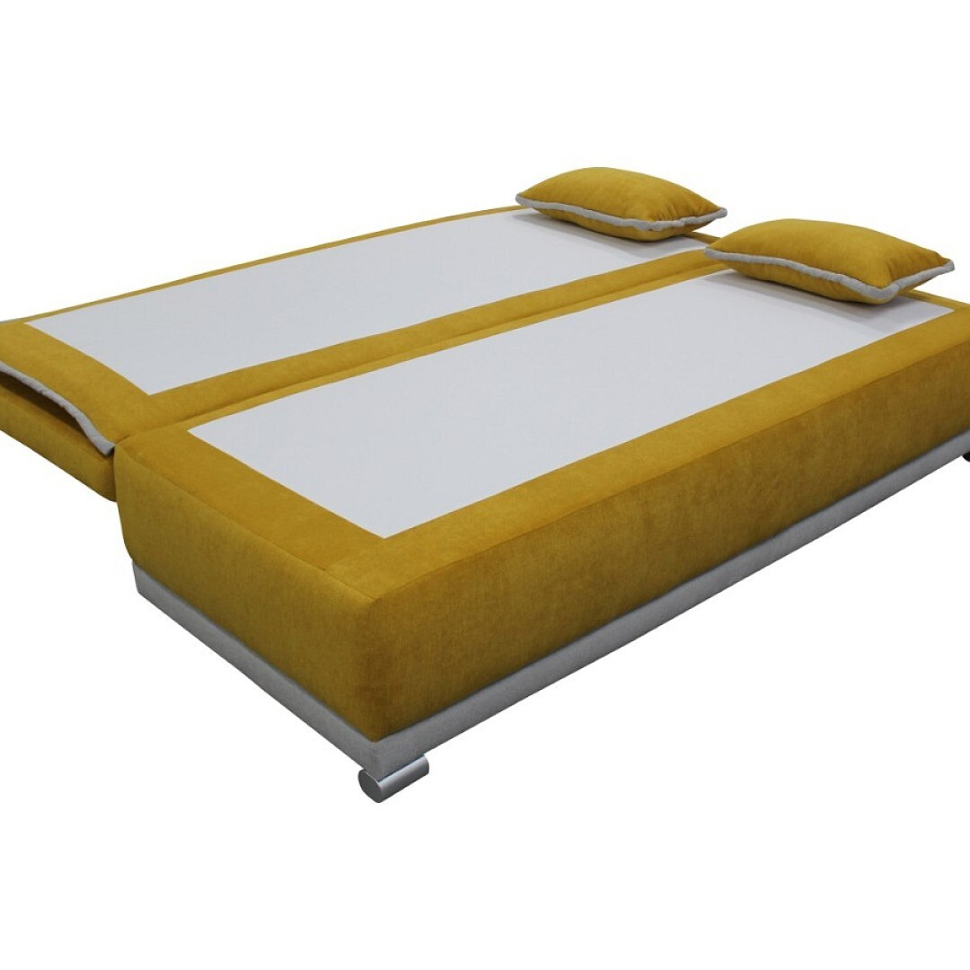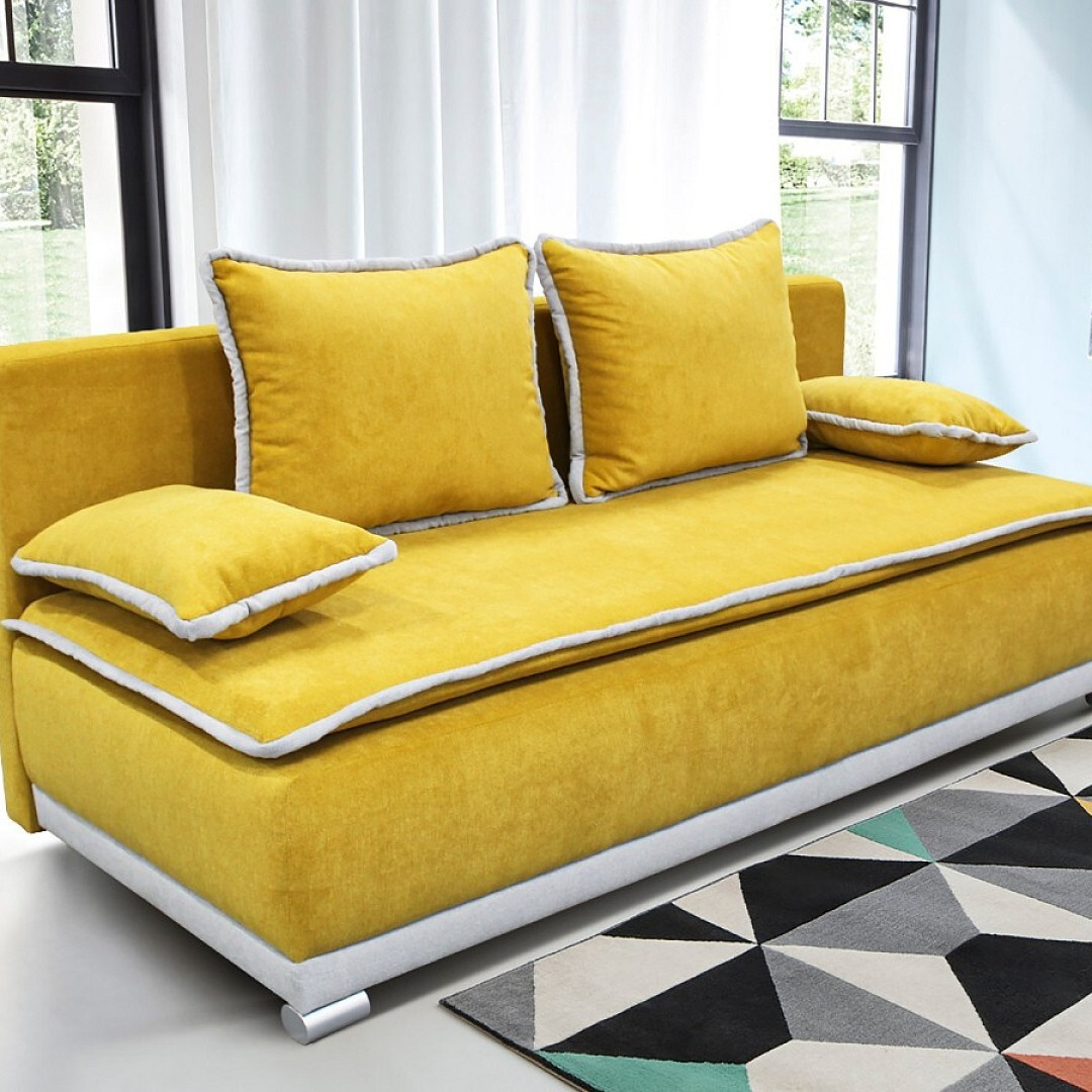 Rozkládací pohovka je v barevné kombinaci potahových látek hořčicová / šedá - Alfa 120 / Alfa 17. Součástí pohovky jsou 2 opěrné polštáře a 2 zádové. Vyplněny polyuretanovou pěnou.