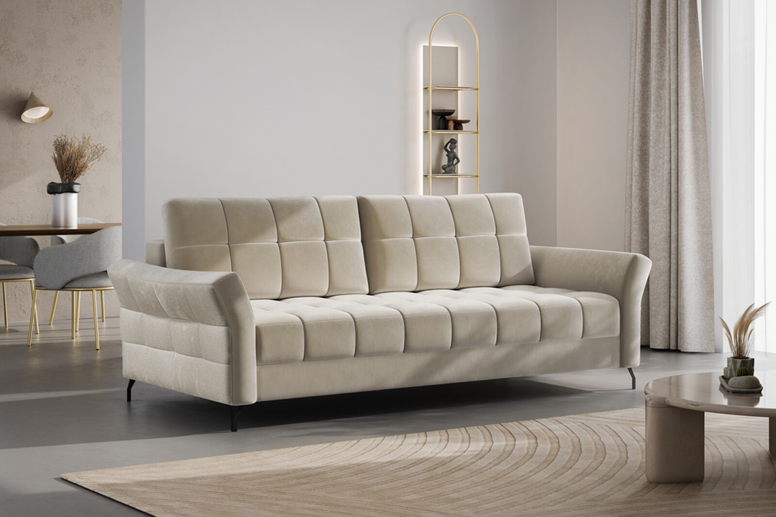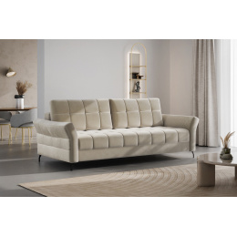 Elegantní třímístná pohovka SAGO s funkcí spaní a úložným prostorem. Pohovka s lehací plochou 150 x 200 cm, na vysokých nožičkách, je vhodná ke každodennímu spaní. Rozkládací pohovka má pružinové jádro Bonnell a vysoce elastickou pěnu. Moderní mechanismus umožňuje rozložit pohovku do polohy pro spaní mírným nadzvednutím sedáku a jeho posunutím dopředu. Volné opěrné polštáře.