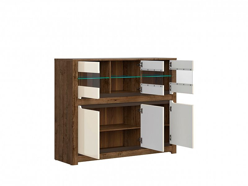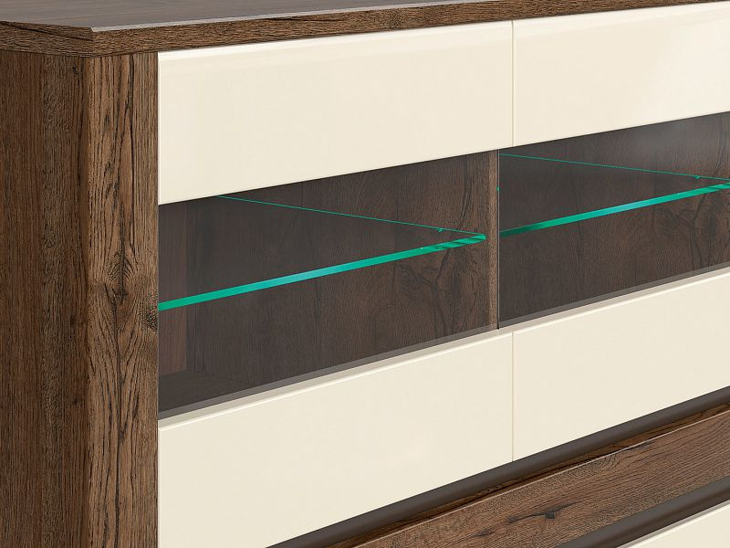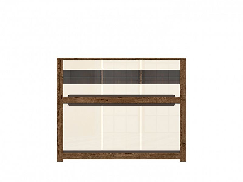 Vitrína KOM3W3D je kombinována - šestidvířková s policemi, spodní dvířka plná, horní dvířka částečně prosklená + skleněné police.Možnost doobjednání LED osvětlení.