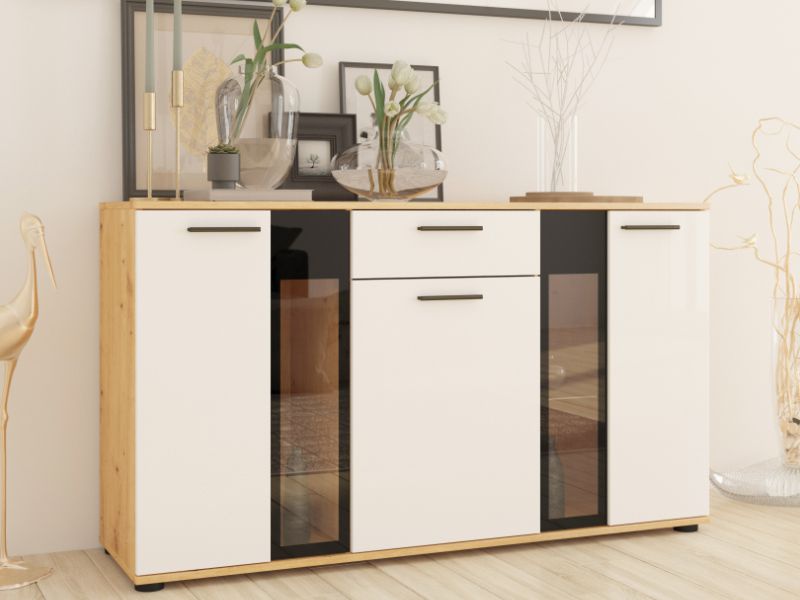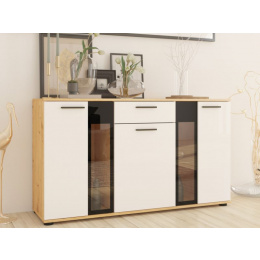 Komoda SALSA se skvělě hodí k doplnění obývací stěny SALSA . Komoda má po stranách a uprostřed dvířka na půl prosklené a uprostřed jeden šuplík. Je v atraktivním provedení barvy - dub artisan / bílá. Komoda je vyrobena z lamina.