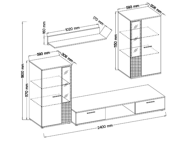 Celá sestava SALSA je složená z: TV stolek, vitrína závěsná, vitrína nízká, police