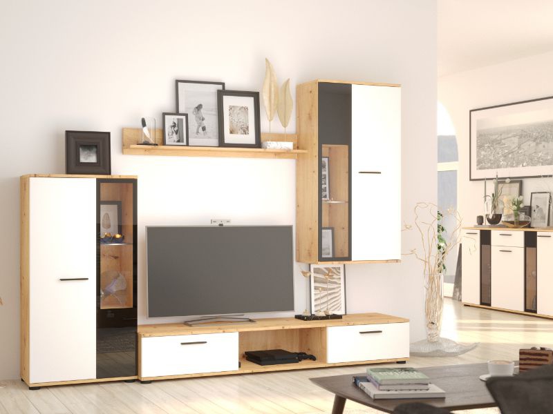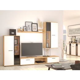 Moderní, designová obývací stěna SALSA za skvělou cenu. Obývací stěna je vyrobená z kvalitního lamina v dekoru dub artisan / bílá. Jednotlivé skříňky je možné ustavit samostatně podle dispozic obývacího pokoje. K proskleným skříňkám můžete dokoupit LED osvětlení . K obývací stěně SALSA lze dokoupit komodou.