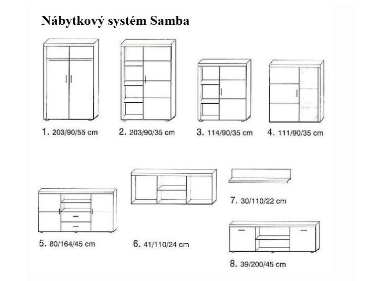 Systémový nábytek SAMBA se skládá z 8 dílů, sami si tak můžete sestavit obývací či studentský pokoj na míru. SAMBA je moderní nábytkový sektor za velmi příznivé ceny. Nábytek SAMBA se vyrábí z kvalitního lamina v barevné kombinaci San Marino / krémová.