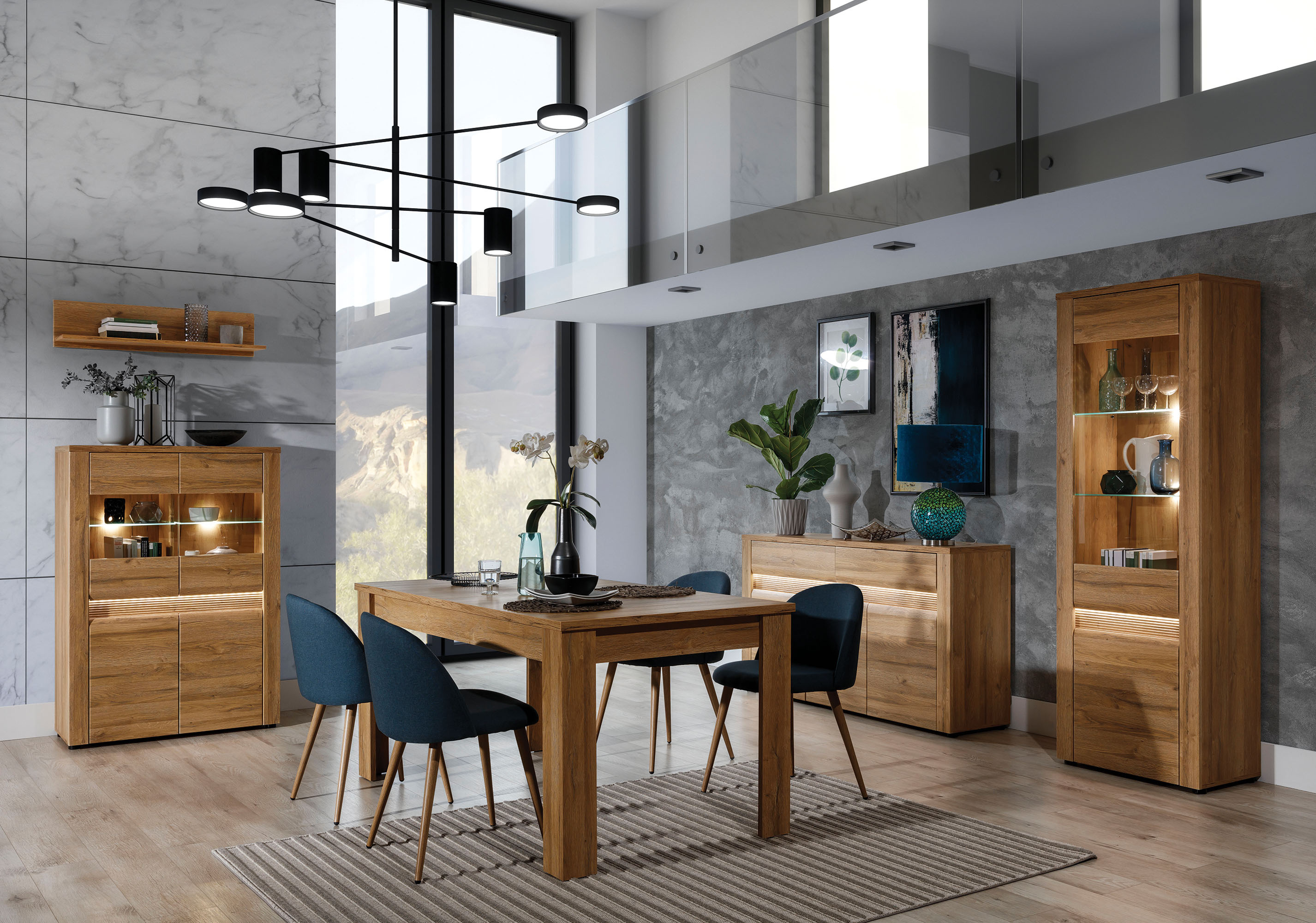 Elegantní systémový nábytek SANDY se vyrábí z kvalitního lamina v dezénu dub grandson. Dřevěný dekor v kombinaci s vnějším LED podsvícením čelních ploch působí elegantním dojmem. V nabídce máte 11 jednotlivých prvků, ze kterých můžete vytvořit obývací pokoj i jídelnu. Korpusy sektoru SANDY mají sílu lamina 16 mm, vrchní desky 22 mm a hrany chrání ABS 0,5 mm a 1,5 mm. Dvířka, se systémem tichého dovírání a šuplíky s kuličkovými pojezdy s plným vysunutím, jsou z MDF potažené PVC folií. Nožičky jsou plastové, čelní skla jsou tvrzená. LED podsvícení skleněných polic je součásti každé vitríny.