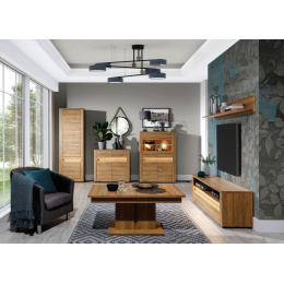 Elegantní systémový nábytek SANDY se vyrábí z kvalitního lamina v dezénu dub grandson. Dřevěný dekor v kombinaci s vnějším LED podsvícením čelních ploch působí elegantním dojmem. V nabídce máte 11 jednotlivých prvků, ze kterých můžete vytvořit obývací pokoj i jídelnu. Korpusy sektoru SANDY mají sílu lamina 16 mm, vrchní desky 22 mm a hrany chrání ABS 0,5 mm a 1,5 mm. Dvířka, se systémem tichého dovírání a šuplíky s kuličkovými pojezdy s plným vysunutím, jsou z MDF potažené PVC folií. Nožičky jsou plastové, čelní skla jsou tvrzená. LED podsvícení skleněných polic je součásti každé vitríny.