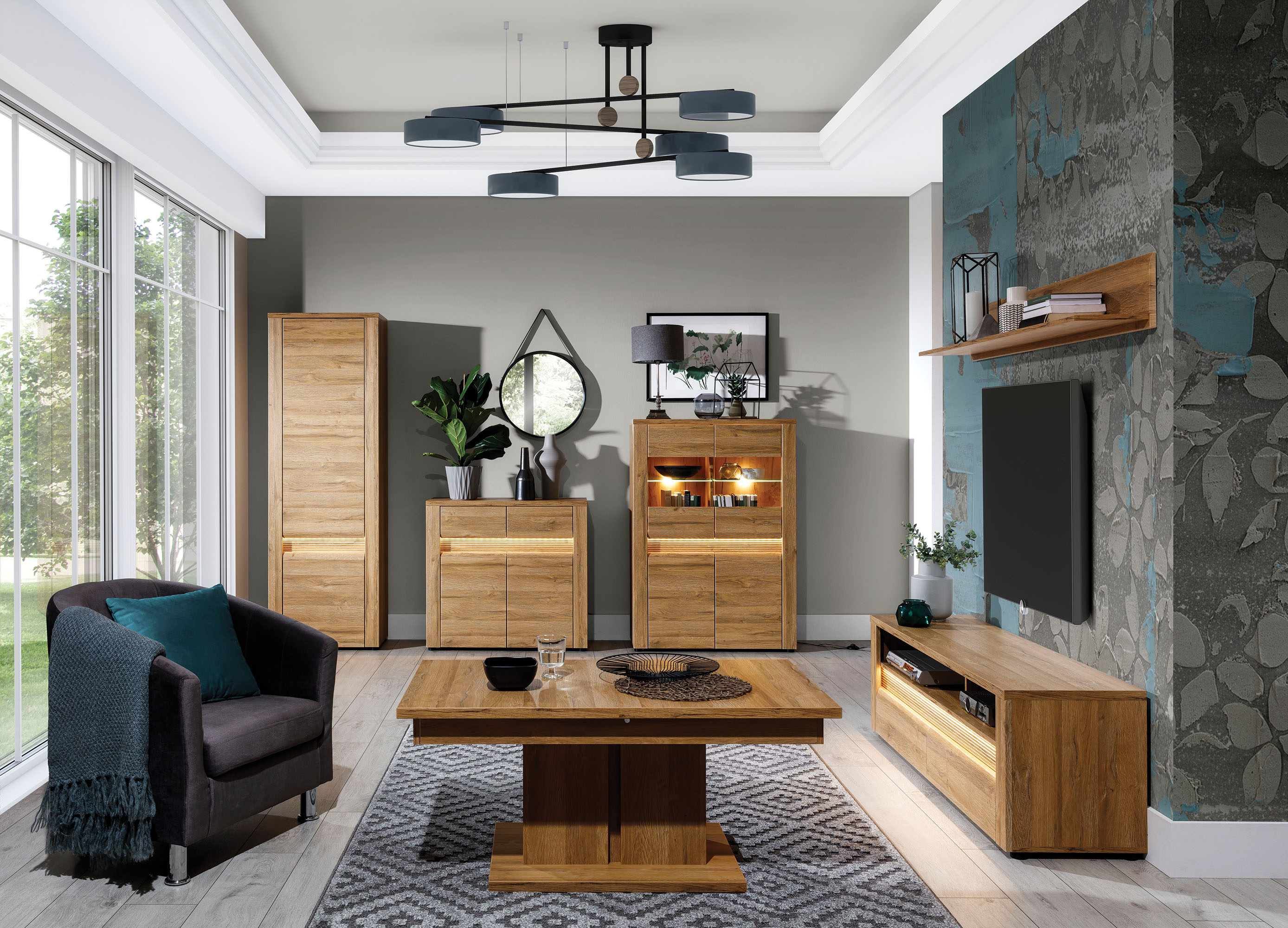 Elegantní systémový nábytek SANDY se vyrábí z kvalitního lamina v dezénu dub grandson. Dřevěný dekor v kombinaci s vnějším LED podsvícením čelních ploch působí elegantním dojmem. V nabídce máte 11 jednotlivých prvků, ze kterých můžete vytvořit obývací pokoj i jídelnu. Korpusy sektoru SANDY mají sílu lamina 16 mm, vrchní desky 22 mm a hrany chrání ABS 0,5 mm a 1,5 mm. Dvířka, se systémem tichého dovírání a šuplíky s kuličkovými pojezdy s plným vysunutím, jsou z MDF potažené PVC folií. Nožičky jsou plastové, čelní skla jsou tvrzená. LED podsvícení skleněných polic je součásti každé vitríny.