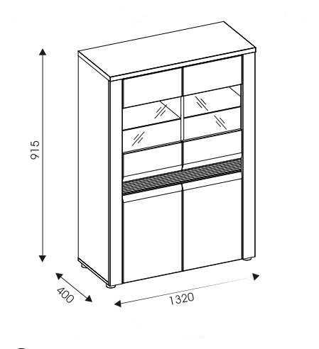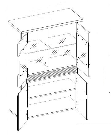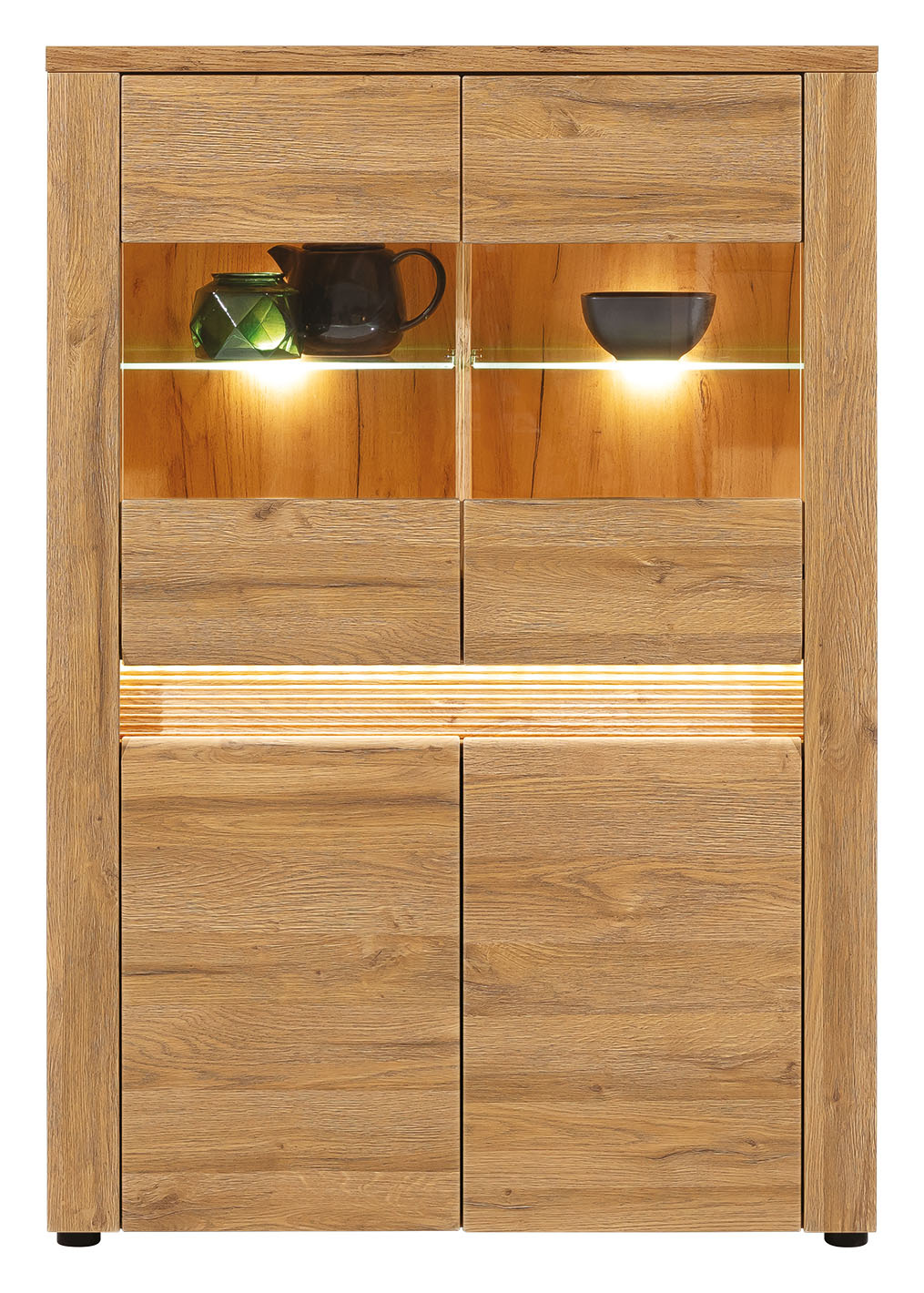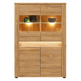 Vitrína S4 ze systému SANDY - čtyř dvířková s policemi, v prosklené části jsou police skleněné, doplněné LED podsvícením