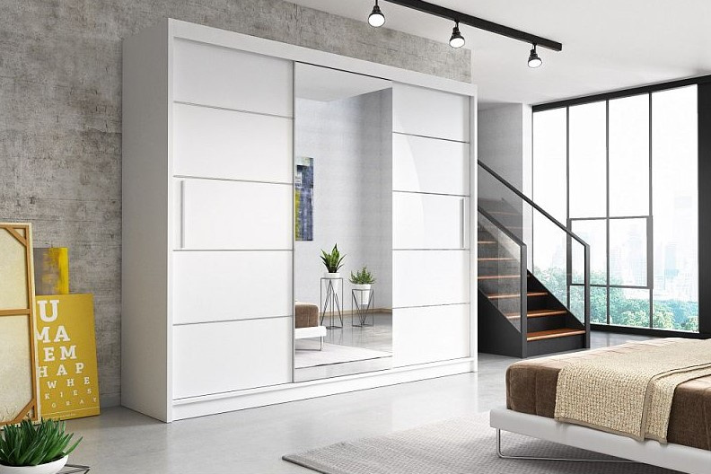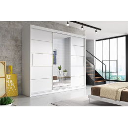 Tato šatní skříň je třídveřová, uprostřed se zrcadlem v barevném provedení bílá / zrcadlo ( viz. foto ). Skříň je vybavená dvěmi řadami polic po stranách a šatní tyčí uprostřed.