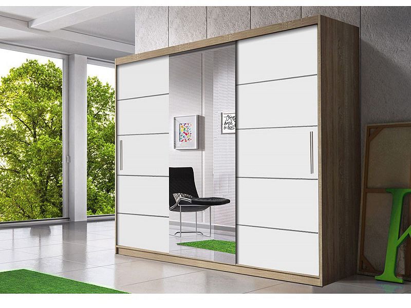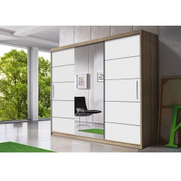 Tato šatní skříň je třídveřová, uprostřed se zrcadlem v barevném provedení dub sonoma / bílá / zrcadlo ( viz. foto ). Skříň je vybavená dvěmi řadami polic po stranách a šatní tyčí uprostřed.