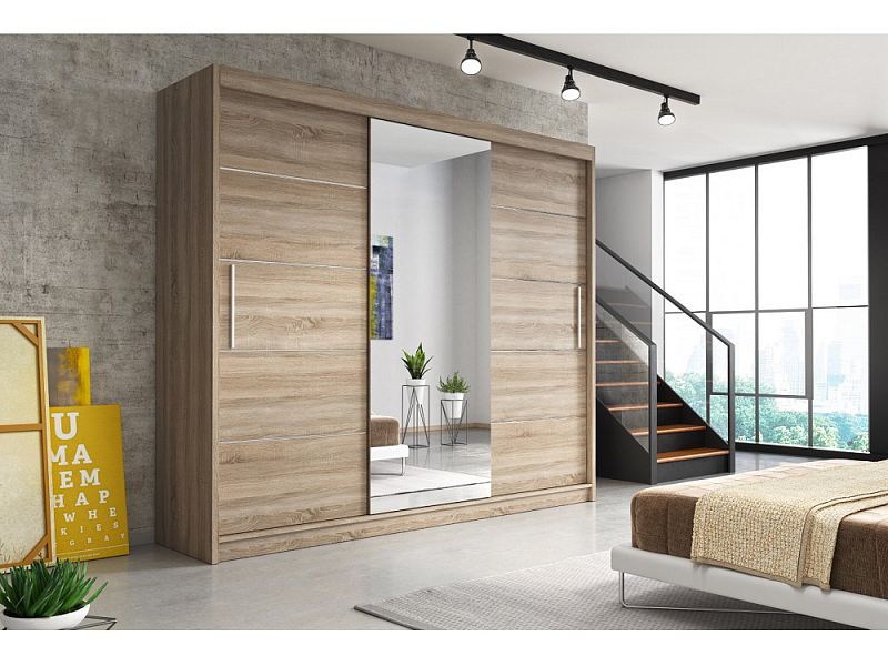 Tato šatní skříň je třídveřová, uprostřed se zrcadlem v barevném provedení dub sonoma / zrcadlo ( viz. foto ). Skříň je vybavená dvěmi řadami polic po stranách a šatní tyčí uprostřed.