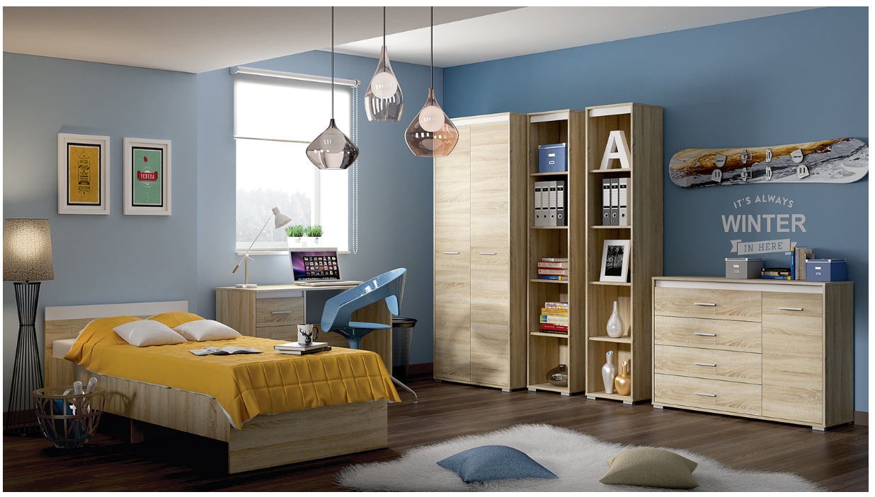 Sektorový nábytek AVO je v barevném provedení: Korpus a dvířka v odstínu dub sonoma, lišta v odstínu bílá.