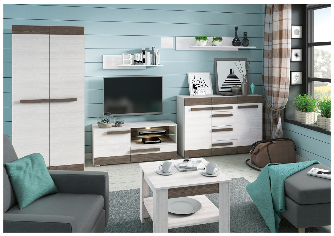 Systém BLANCO je moderní nábytek s přirozeným zabarvením, které poskytuje mnoho variant pro praktické uspořádání. Kombinace bílé a šedé borovice je perfektní jak pro moderní obývací pokoj, tak i pro vybavení pokoje teenagerů. Unikátní design dřevěných rukojetí dává nábytku charakter a styl. Sektor Blanco je praktické, originální řešení neobvyklého designu pro vybavení Vašich pokojů.