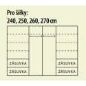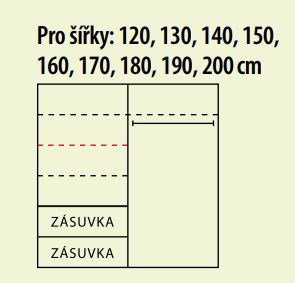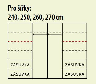Tuto šatní skříň si můžete objednat v roměrech 120 - 270 cm. Skříň DUO je dodávána v plné výbavě s posuvnými dveřmi. Úchyt - hliník v kombinaci dřeviny v barvě korpusu.