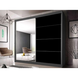 Šatní skříň EDDIE s posuvnými dveřmi a zrcadlem. Moderní kombinace dekoru grafit / černý pololesk. Na posuvných dveřích skříně je zrcadlo. Barva druhých dveří je v černém pololesku. Korpus je v barvě grafit. Skříň má posuvné dveře, která mají kvalitní systém posuvu (kovové vodítka + válečky na ložiskách), díky nimž dveře hladce kloužou. Použitý systém posuvných dveří usnadní každodenní používání. Uprostřed je skříň rozdělena na dvě části vybavené policemi a šatní tyčí.