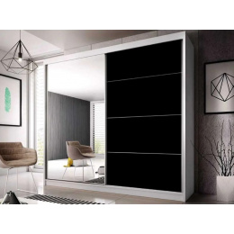 Šatní skříň EDDIE s posuvnými dveřmi a zrcadlem. Moderní kombinace dekoru bílá / černý pololesk. Na posuvných dveřích skříně je zrcadlo. Barva druhých dveří je v černém pololesku. Korpus je bílý. Skříň má posuvné dveře, která mají kvalitní systém posuvu (kovové vodítka + válečky na ložiskách), díky nimž dveře hladce kloužou. Použitý systém posuvných dveří usnadní každodenní používání. Uprostřed je skříň rozdělena na dvě části vybavené policemi a šatní tyčí.