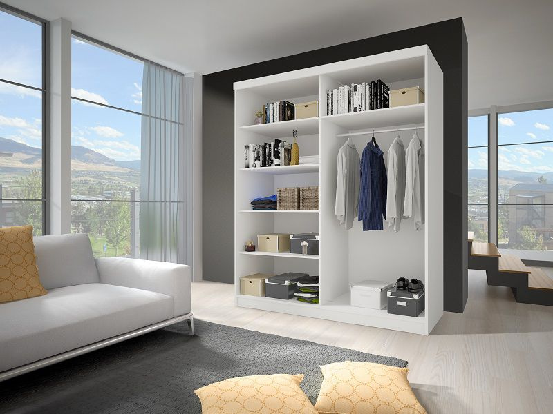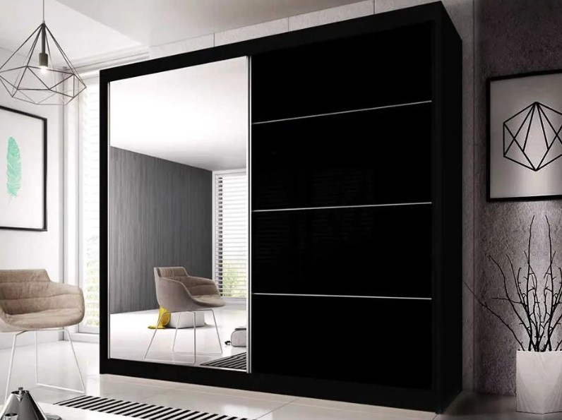 Šatní skříň EDDIE s posuvnými dveřmi a zrcadlem. Moderní kombinace dekoru černá / černý pololesk. Na posuvných dveřích skříně je zrcadlo. Barva druhých dveří je v černém pololesku. Korpus je černý. Skříň má posuvné dveře, která mají kvalitní systém posuvu (kovové vodítka + válečky na ložiskách), díky nimž dveře hladce kloužou. Použitý systém posuvných dveří usnadní každodenní používání. Uprostřed je skříň rozdělena na dvě části vybavené policemi a šatní tyčí.