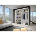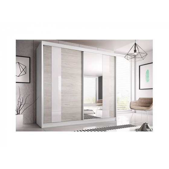 Šatní skříň EDDIE se zrcadlem na přední straně. Moderní kombinace barev bílá nebo dub sonoma s břízou kalhut. Na posuvných dveřích skříně  je zrcadlo a bílé  sklo. Skříň má posuvnou přední část, která používá kvalitní systém posuvu (kovové vodítka + válečky na ložiskách), díky nimž dveře hladce kloužou. Použitý systém posuvných dveří usnadní každodenní používání. Uprostřed je skříň rozdělena na dvě části vybavené policemi a šatní tyčí.