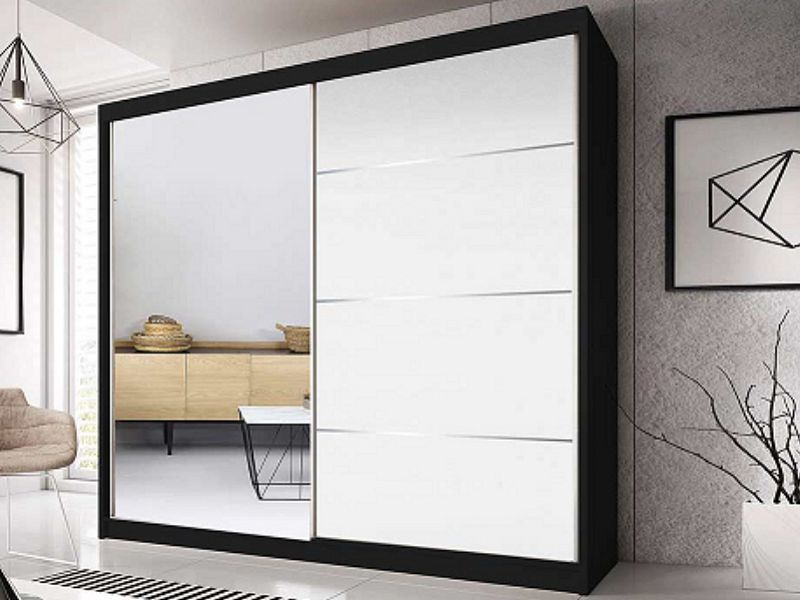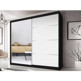 Šatní skříň EDDIE s posuvnými dveřmi a zrcadlem. Moderní kombinace atraktivní černé barvy / bílá pololesk.  Na posuvných dveřích skříně  je zrcadlo. Barva druhých dveří je v bílém pololesku. Korpus je černý. Skříň má posuvné dveře, která mají kvalitní systém posuvu ( kovové vodítka + válečky na ložiskách ), díky nimž dveře hladce kloužou. Použitý systém posuvných dveří usnadní každodenní používání. Uprostřed je skříň rozdělena na dvě části vybavené policemi a šatní tyčí.