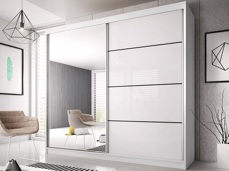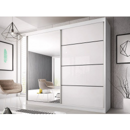 Šatní skříň EDDIE s posuvnými dveřmi a zrcadlem. Moderní kombinace barev bílá / bílá pololesk.  Na posuvných dveřích skříně  je zrcadlo. Barva druhých dveří je v bílém pololesku. Korpus je bílý. Skříň má posuvné dveře, která mají kvalitní systém posuvu ( kovové vodítka + válečky na ložiskách ), díky nimž dveře hladce kloužou. Použitý systém posuvných dveří usnadní každodenní používání. Uprostřed je skříň rozdělena na dvě části vybavené policemi a šatní tyčí.