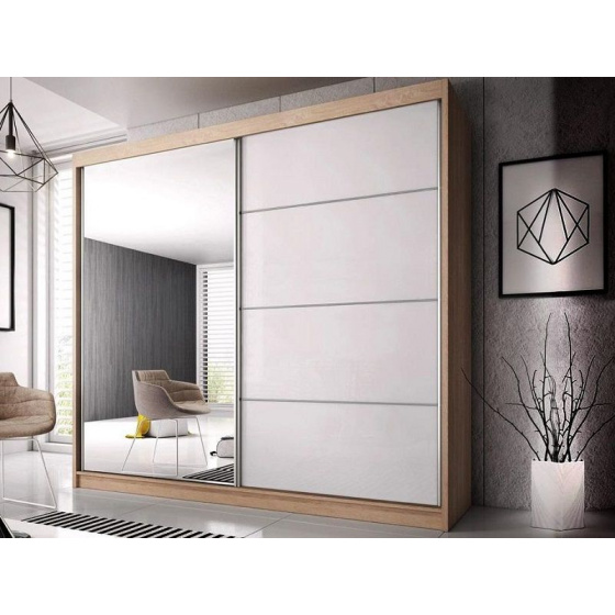 Šatní skříň EDDIE s posuvnými dveřmi a zrcadlem. Moderní kombinace přírodního dekoru dub sonoma / bílá pololesk. Na posuvných dveřích skříně je zrcadlo. Barva druhých dveří je v bílém pololesku. Korpus je dub sonoma. Skříň má posuvné dveře, která mají kvalitní systém posuvu ( kovové vodítka + válečky na ložiskách ), díky nimž dveře hladce kloužou. Použitý systém posuvných dveří usnadní každodenní používání. Uprostřed je skříň rozdělena na dvě části vybavené policemi a šatní tyčí.
