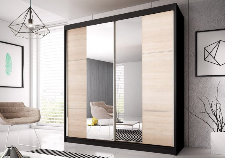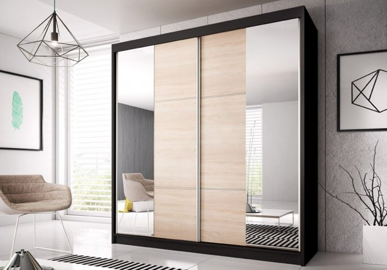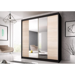 Šatní skříň EDDIE 36 vyniká svou jednoduchostí a prostou elegancí. Kombinací přírodního dekoru dub sonoma a černé, budou působit velice příjemně na pohled. Díky šatní skříni EDDIE si vytvoříte útulnou ložnici, kde si budete moct užívat klidného a ničím nerušeného spánku. Skříň EDDIE disponuje policemi na drobné oděvy, šatní tyčí na zavěšení bund a také velikým zrcadlem na dvířkách, které projasní a opticky zvětší prostor. Volitelná montáž dveří.