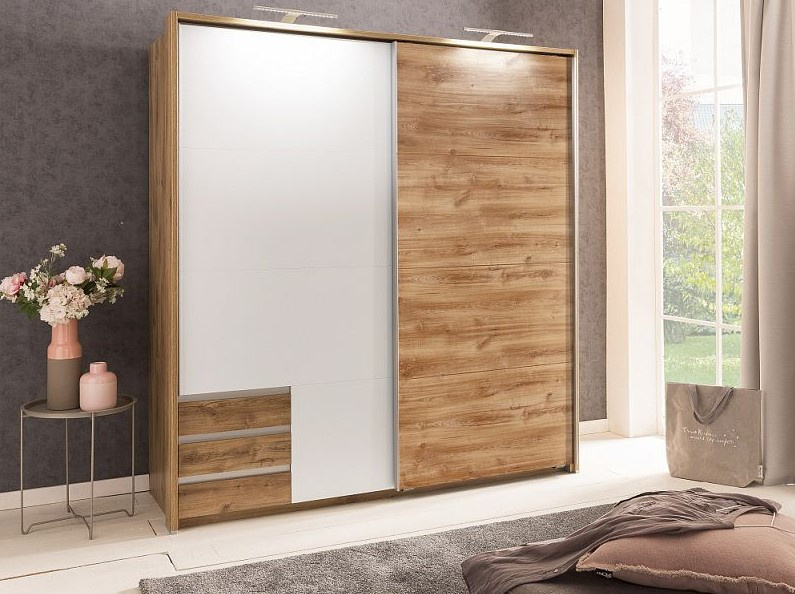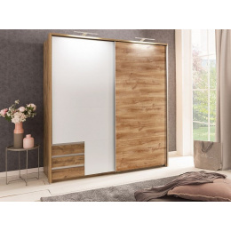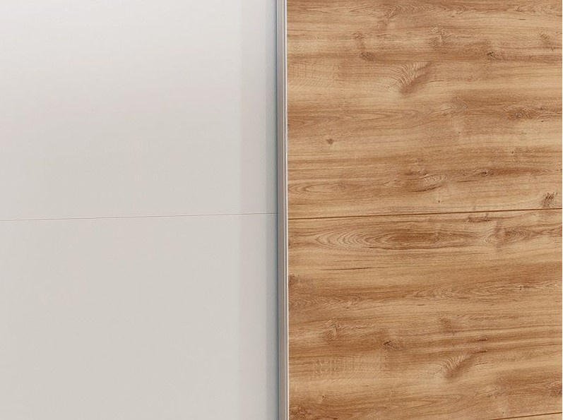Šatní skříň EMILIA je vyrobena z lamina v barevném provedení dub planket/bílá. Za dvířky je k dispozici šatní tyč pro zavěšení košil a kabátů, dále pak police. Ve spodní části jsou umístěny zásuvky. Dodává se bez okrasné lišty a LED osvětlení. Okrasnou lištu je možné dokoupit za příplatek. V případě zájmu uveďte do poznámky.
