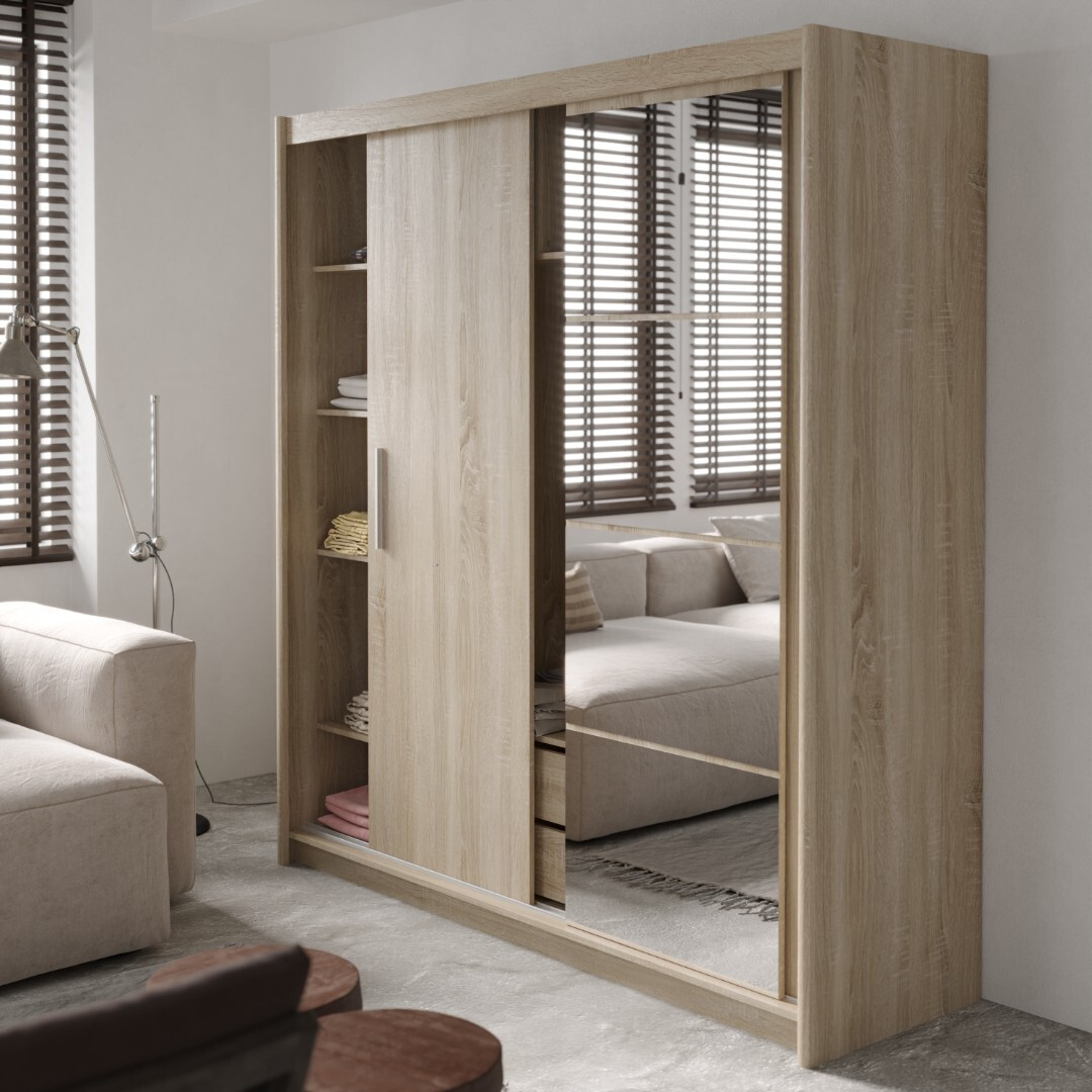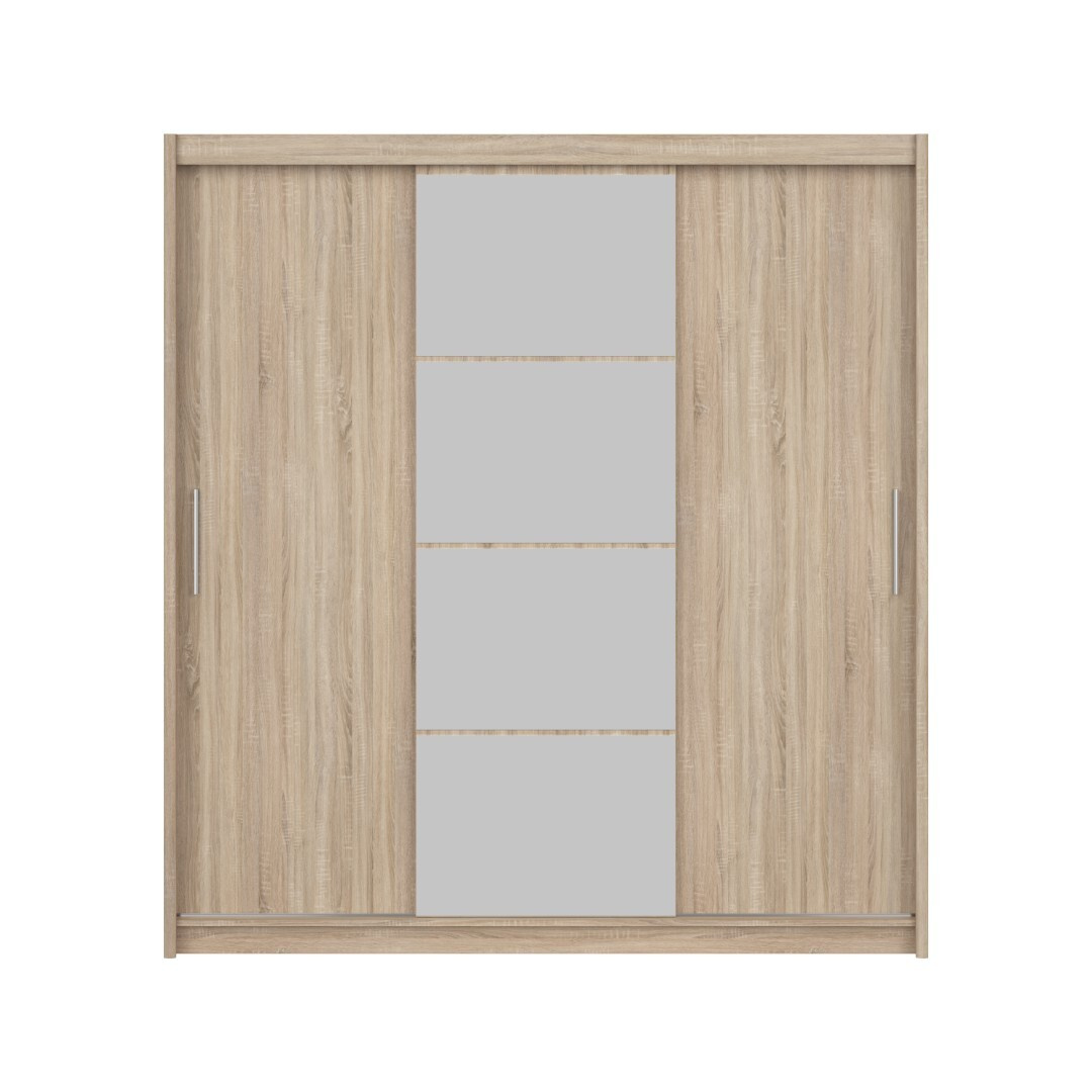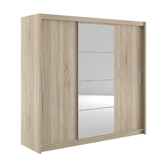 Moderní kombinovaná šatní skříň FADO 235. Šatní skříň FADO 235 je vyrobená z kvalitního lamina v dekoru dub sonoma s posuvnými dveřmi a zrcadlem ve střední části. Je ideální pro umístění do různých místností v domě ať už jde o obývací pokoj, ložnici, nebo předsíň. Vnitřek skříně je rozvržený do posledního detailu. Díky tomu budete mít neustále přehled o tom, kde se co nachází...