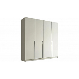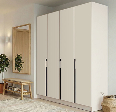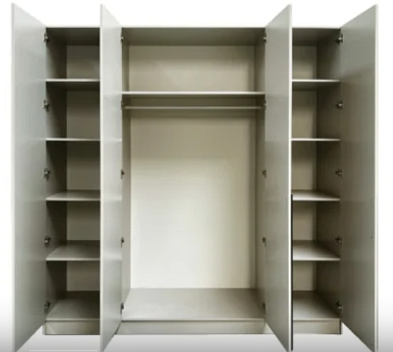 Kombinovaná šatní skříň čtyřdveřová s policemi a šatní tyčí.