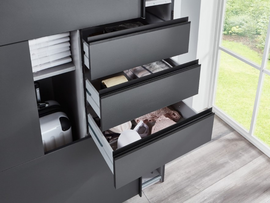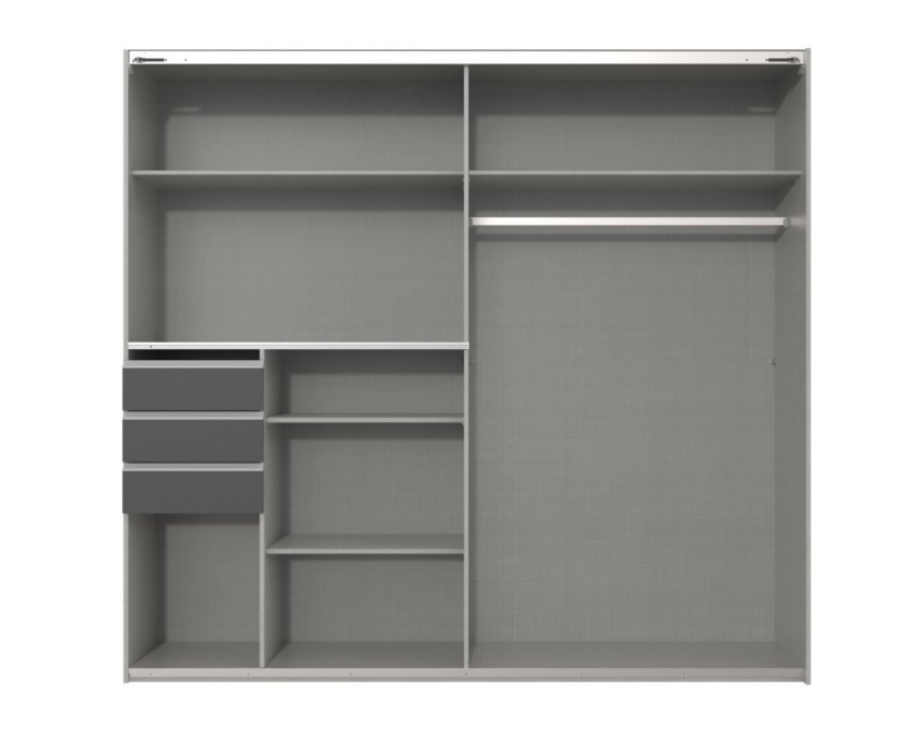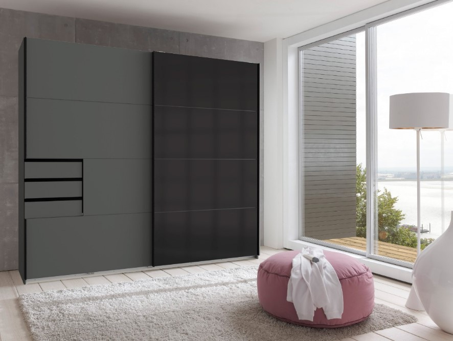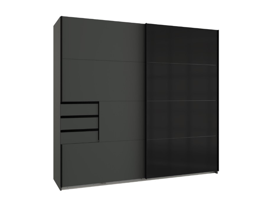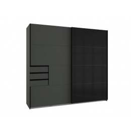 Prostorná šatní skříň HADES je ideálně organizovaná pro oblečení každého člena domácnosti. Barevné provedení lamina grafit/černé sklo se jen tak neokouká. Součástí šatní skříně HADES jsou police, zásuvky a šatní tyč na ramínka, na která je možné zavěsit kabáty, bundy, košile či šaty a sukně.