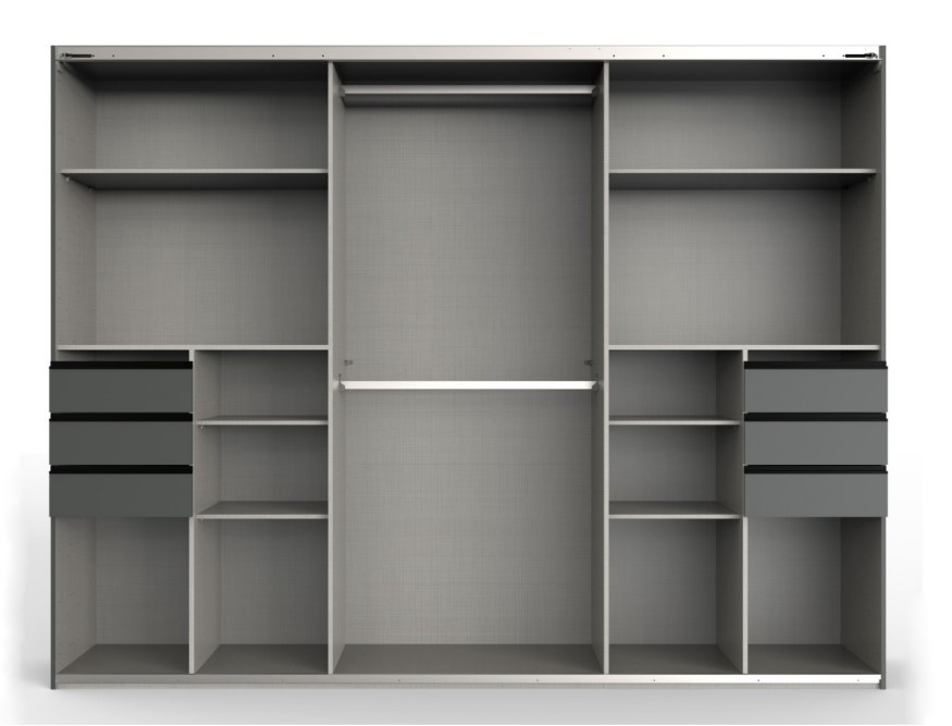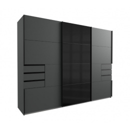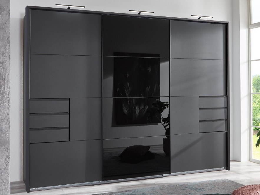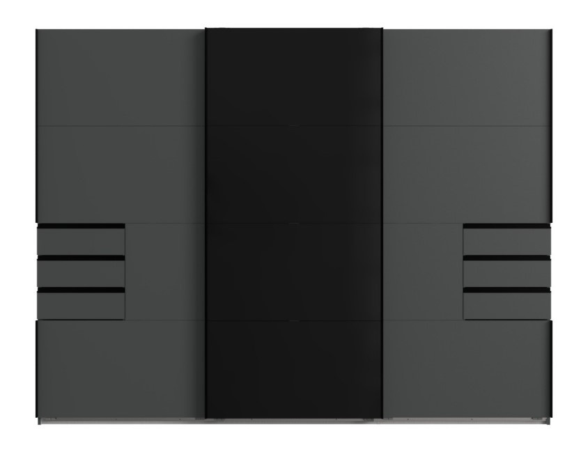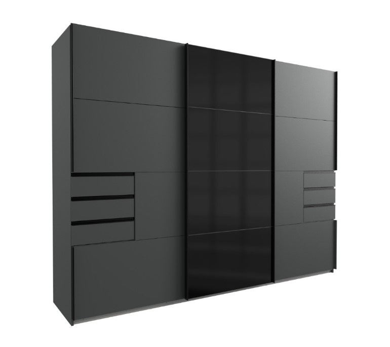 Prostorná šatní skříň HADES je ideálně organizovaná pro oblečení každého člena domácnosti. Barevné provedení lamina grafit/černé sklo se jen tak neokouká. Součástí šatní skříně HADES jsou police, zásuvky a šatní tyč na ramínka, na která je možné zavěsit kabáty, bundy, košile či šaty a sukně.