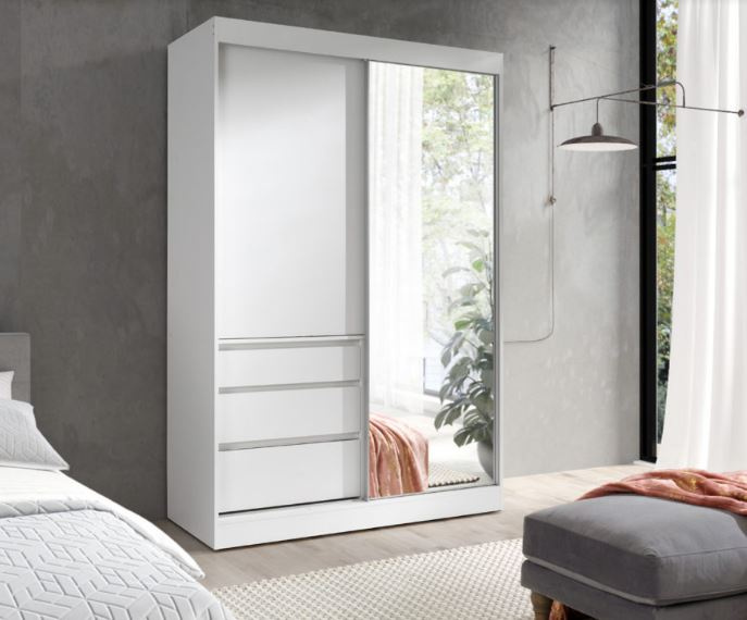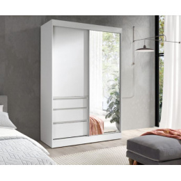 Velká šatní skříň HAITI 140 s posuvnými dveřmi a zrcadlem nabízí množství úložného prostoru pro uložení všech Vašich věcí. Lze ji použít samostatně v ložnici nebo předsíni, nebo s ní můžete doplnit nábytek ve stejném dekoru. Skříň je vyrobená z kvalitního lamina v bílé barvě.