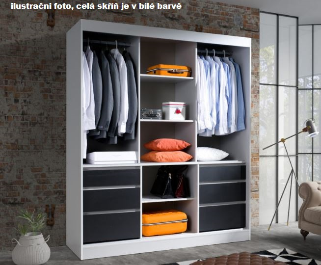 Šatní skříň HAITI 180 - posuvné troj dveře se zrcadlem, po stranách šatní tyče a po nimi po tří šuplíky, uprostřed za dveřmi se zrcadlem jsou police