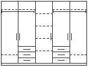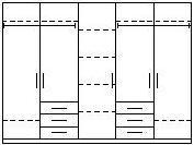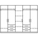 V základním provedení je skříň vybavená policemi + šuplíky + šatní tyčí + zrcadly, viz rozkres.