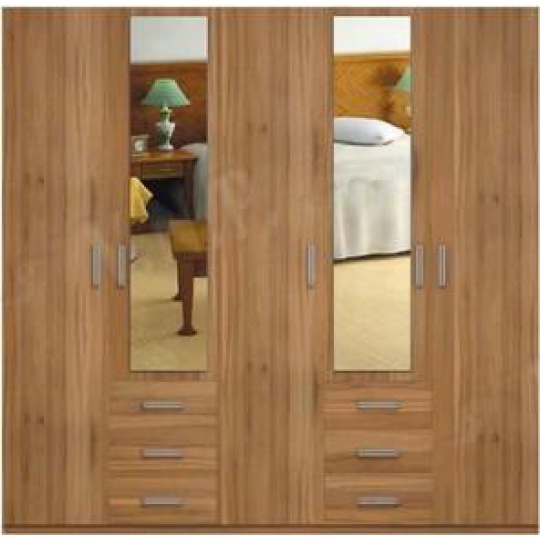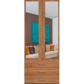 Skříň KOMBI 7B je dodávána s policemi, šatní tyčí a šuplíky, dveře nad šuplíky mají zrcadla. Úchyty - kovové, možnost výběru.