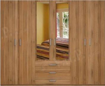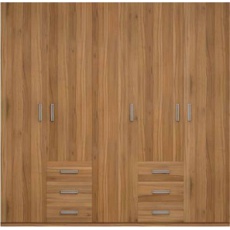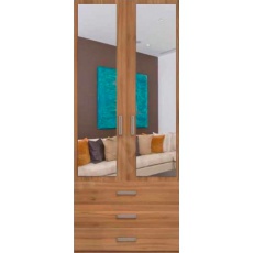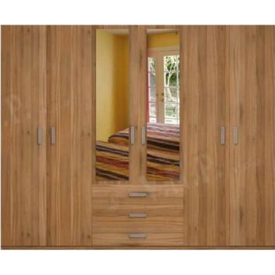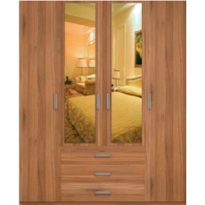 Skříň KOMBI 8B je dodávána s policemi, šatní tyčí a šuplíky, dveře nad šuplíky mají zrcadla. Úchyty - kovové, možnost výběru.