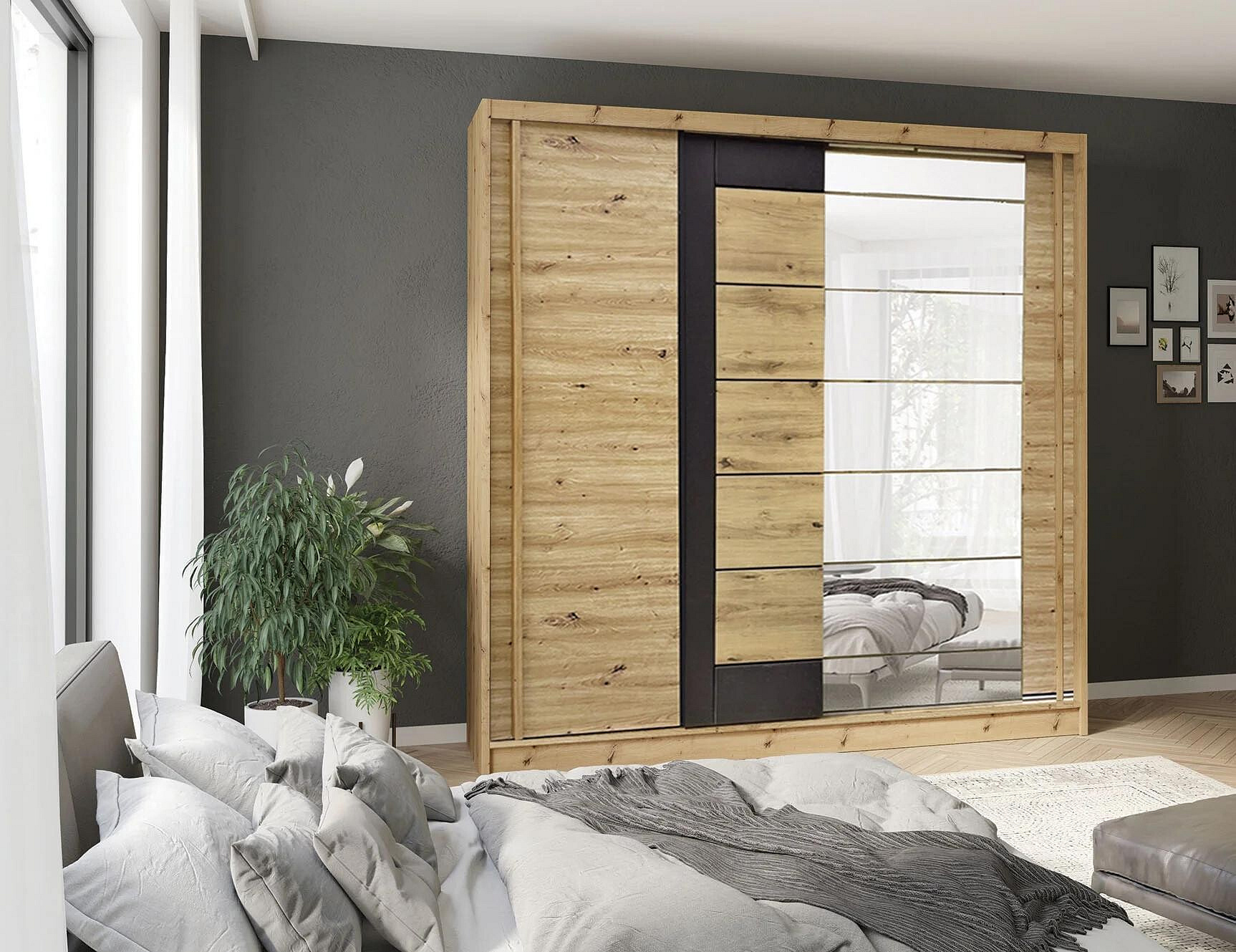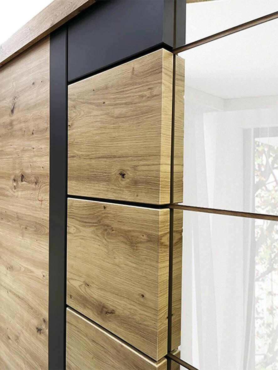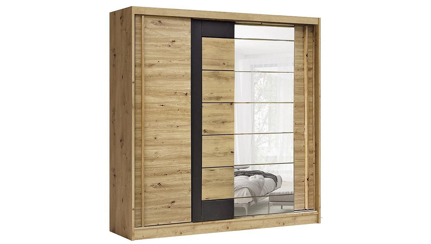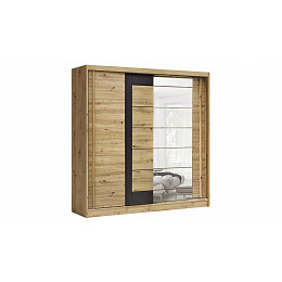 Šatní skříň kombinovaná MOBILE. Základem nábytku jsou kvalitní materiály s vysokou odolnost po celou dobu užívaní. Kombinace v barevném provedení artisan / grafit s detailem z MDF v dekoru dub. Skříň má posuvné dveře se zrcadlem a je vybavená policemi a šatní tyčí.