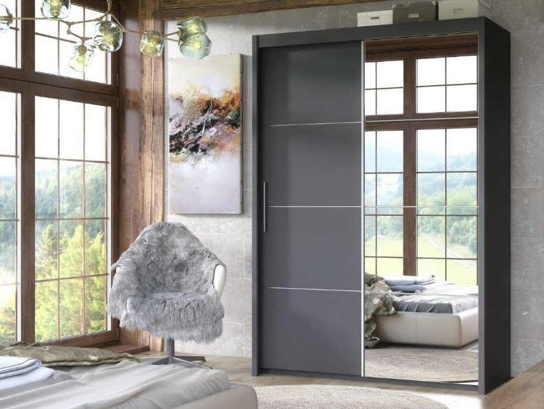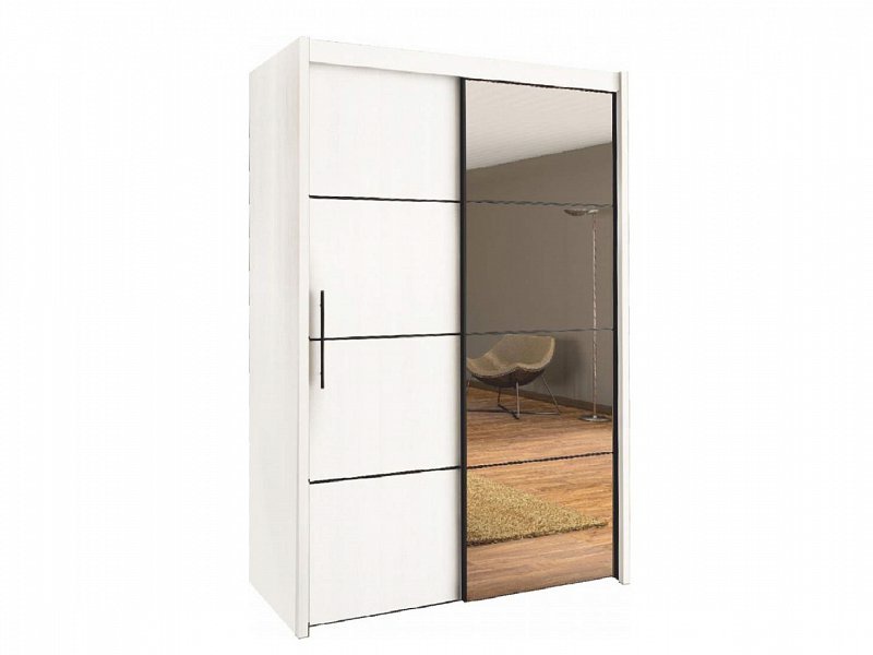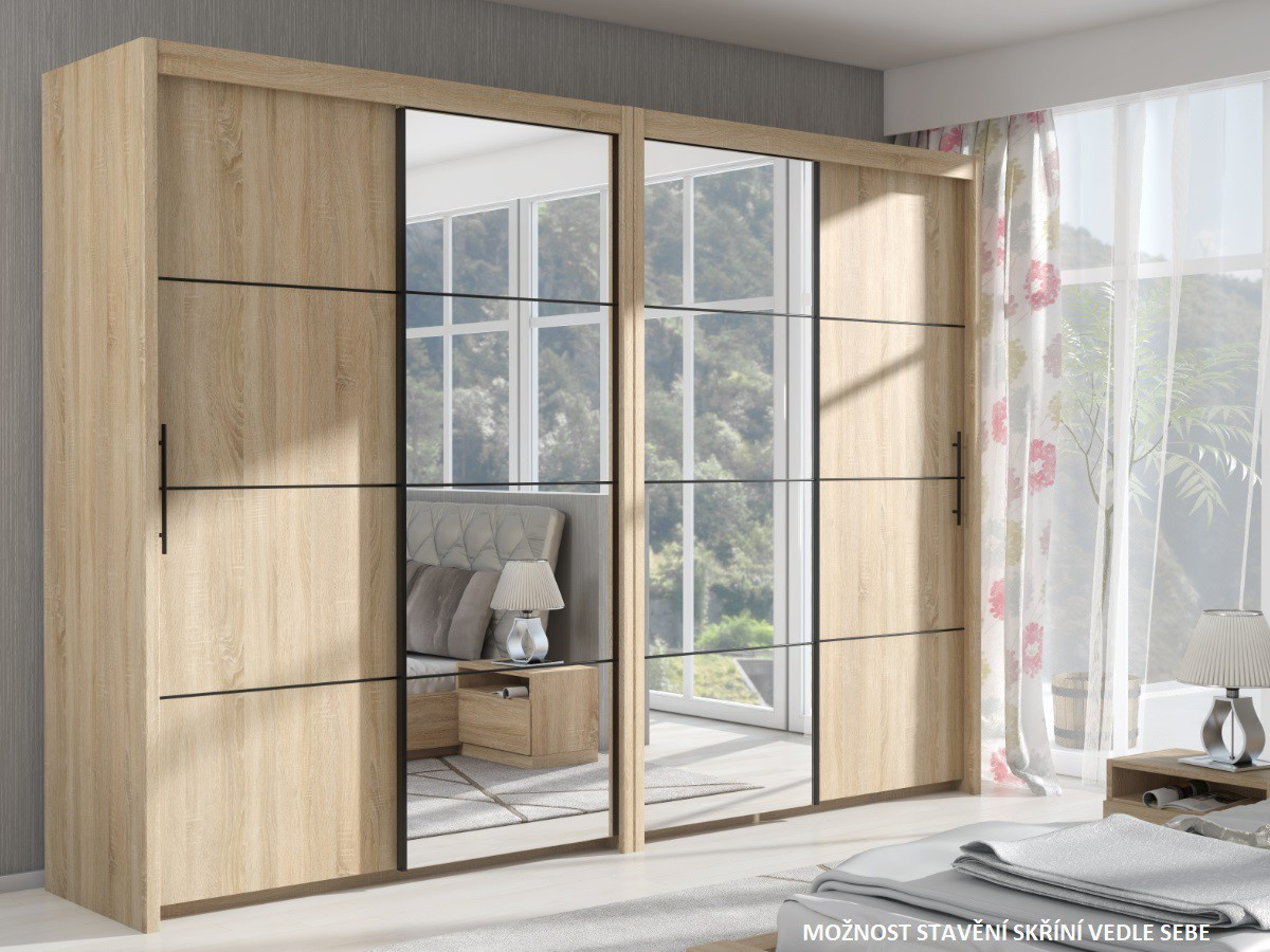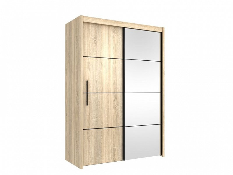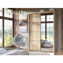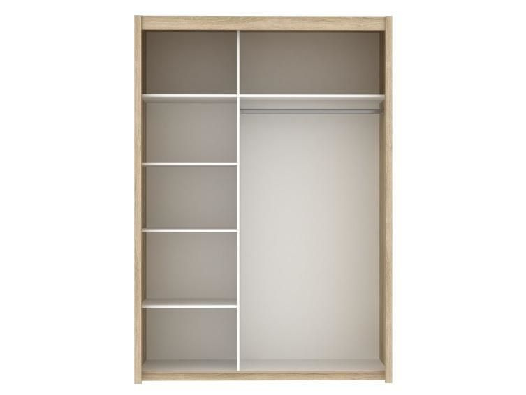 Praktická šatní skříň Nova 150, s posuvnými dveřmi v moderním barevném provedení dub sonoma nebo bílá, se zrcadlem. Skříň šíře 150 cm je rozdělena na dvě částí, v níž jsou police a šatní tyče. Pravá část této skříně je šatní s jednou policí a tyčí na zavěšení ramínek. Levá část skříně je policová. Díky vnitřnímu uspořádání skříně má každá věc své místo.