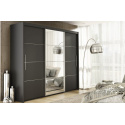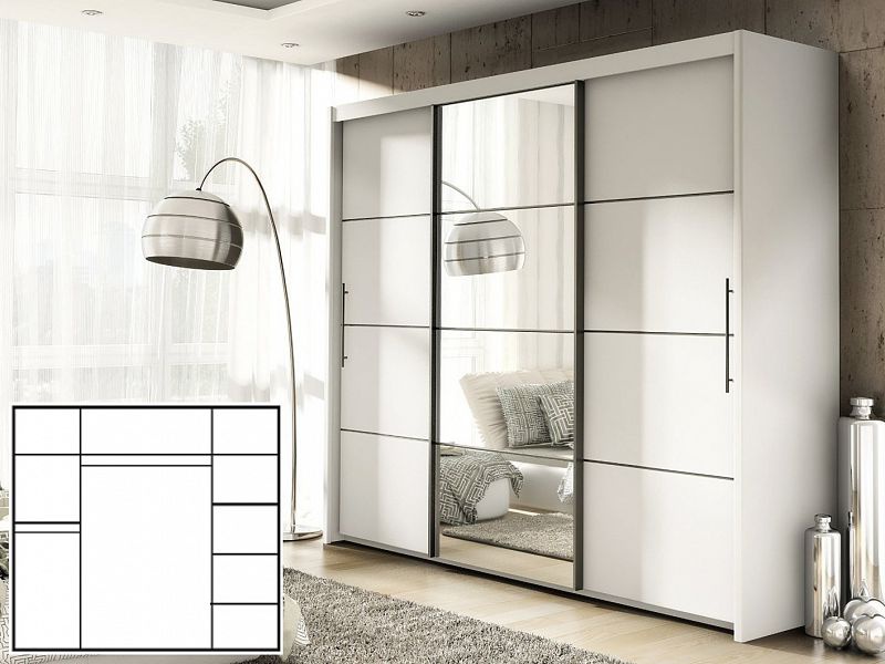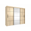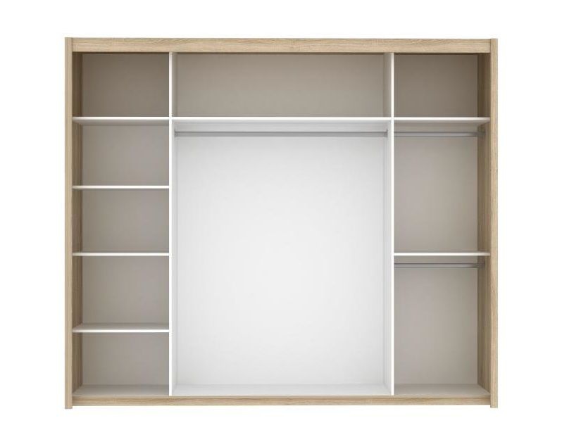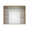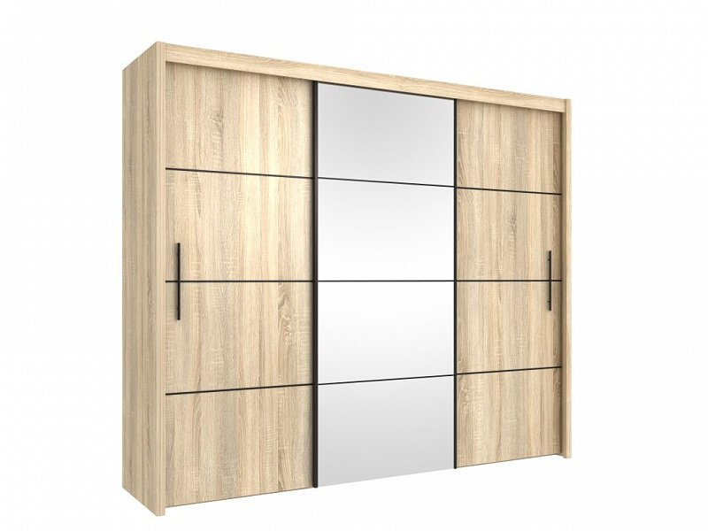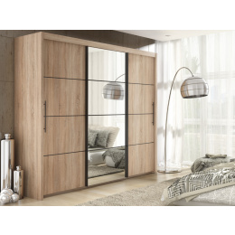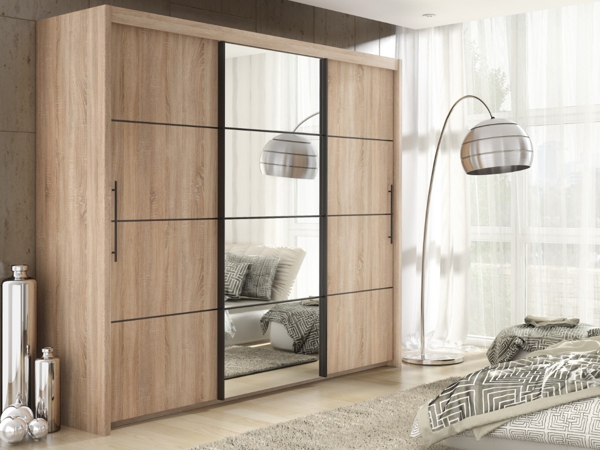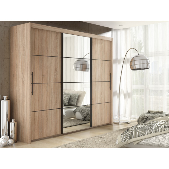 Praktická šatní skříň Nova 250, s posuvnými dveřmi v moderním barevném provedení dub sonoma, bílá a grafit, se zrcadlem. Skříň šíře 250 cm je rozdělena na dvě částí, v níž jsou police a šatní tyče. prostřední část této skříně je šatní s jednou policí a tyčí na zavěšení ramínek. Krajní části skříně jsou policové. Díky vnitřnímu uspořádání skříně má každá věc své místo.