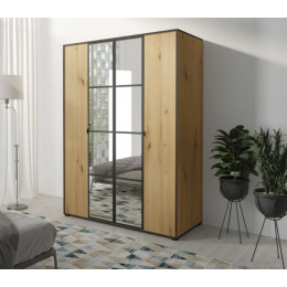Velká šatní skříň OSLO I 150 s klasickými otevíráním dveří a zrcadly nabízí množství úložného prostoru pro uložení všech Vašich věcí. Lze ji použít samostatně v ložnici nebo předsíni nebo s ní můžete doplnit nábytek ve stejném dekoru. Skříň je vyrobená z kvalitního lamina v dekoru dub artisan, ozdobné rámečky jsou v černé barvě. Úchytky jsou černé plastové .