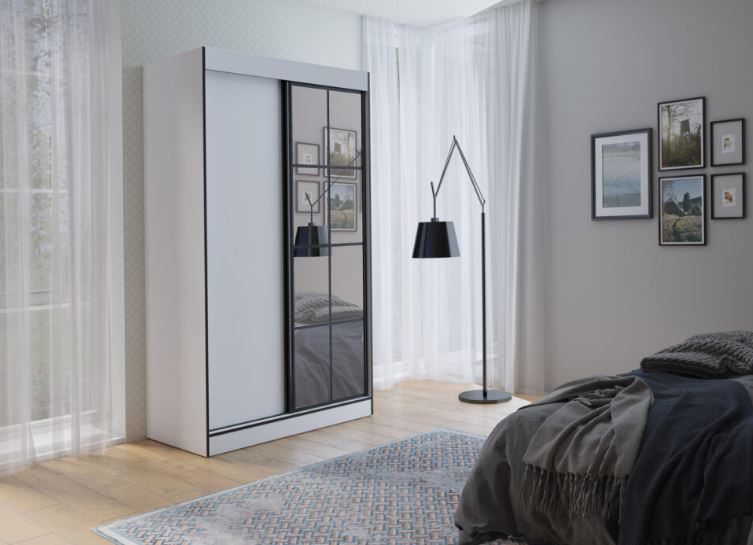 Velká šatní skříň OSLO II 120 s posuvnými dveřmi a zrcadlem nabízí množství úložného prostoru pro uložení všech Vašich věcí. Lze ji použít samostatně v ložnici nebo předsíni, nebo s ní můžete doplnit nábytek ve stejném dekoru. Skříň je vyrobená z kvalitního lamina v barevném provedení bílá, ozdobné rámečky a hrany jsou v černé barvě.