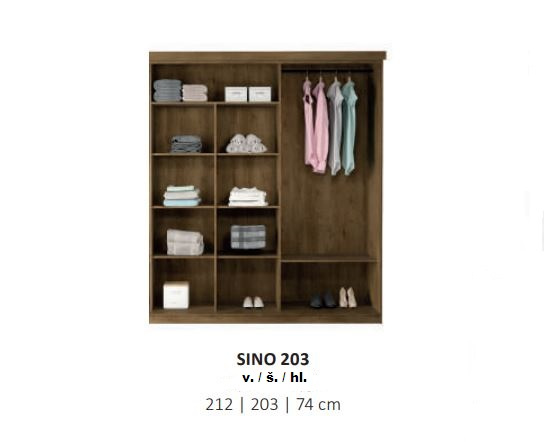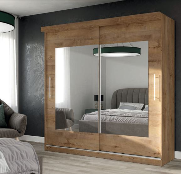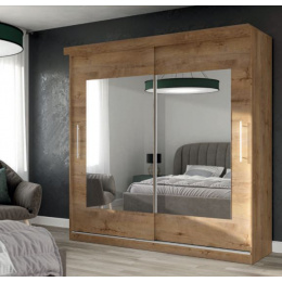 Moderní kombinovaná šatní skříň MAXIM s posuvnými dveřmi a se zrcadly. Skříň šíře 203 cm je rozdělena do dvou částí. Část skříně je šatní s jednou policí dole a tyčí na zavěšení ramínek. V další části skříně jsou police. Díky vnitřnímu uspořádání skříně má každá věc své místo. Skříň je vyrobená z kvalitního lamina v dekoru Dub Lefkas.