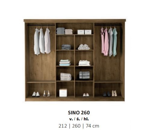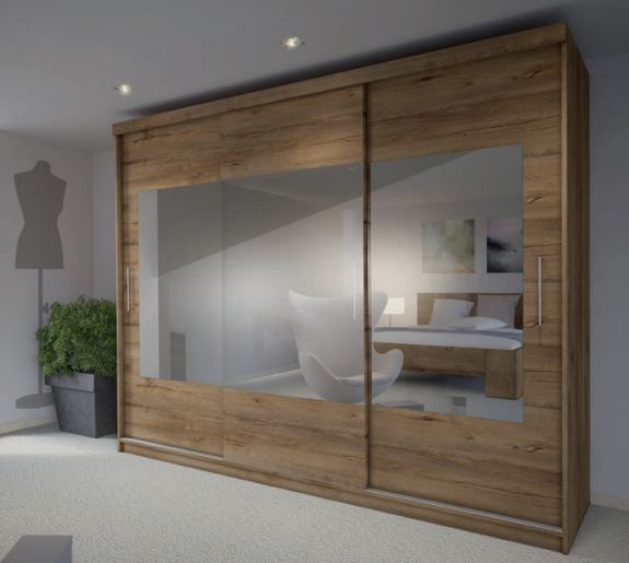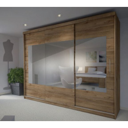 Moderní kombinovaná šatní skříň MAXIM s posuvnými dveřmi a se zrcadly. Skříň šíře 260 cm je rozdělena do tří částí. Po stranách skříně jsou tyče na zavěšení ramínek a po jedné polici dole. V prostřední části skříně jsou police. Díky vnitřnímu uspořádání skříně má každá věc své místo. Skříň je vyrobená z kvalitního lamina v dekoru Dub Lefkas.