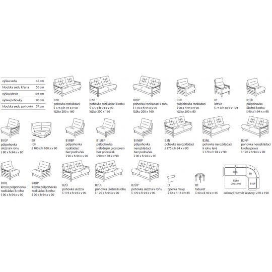 - pohovka rozkládací - š. 175 cm, hl. 94 cm, v. 90 cm ( rozklad 160 x 200 cm ), výška sedu 45 cm, hloubka sedu 57 cm