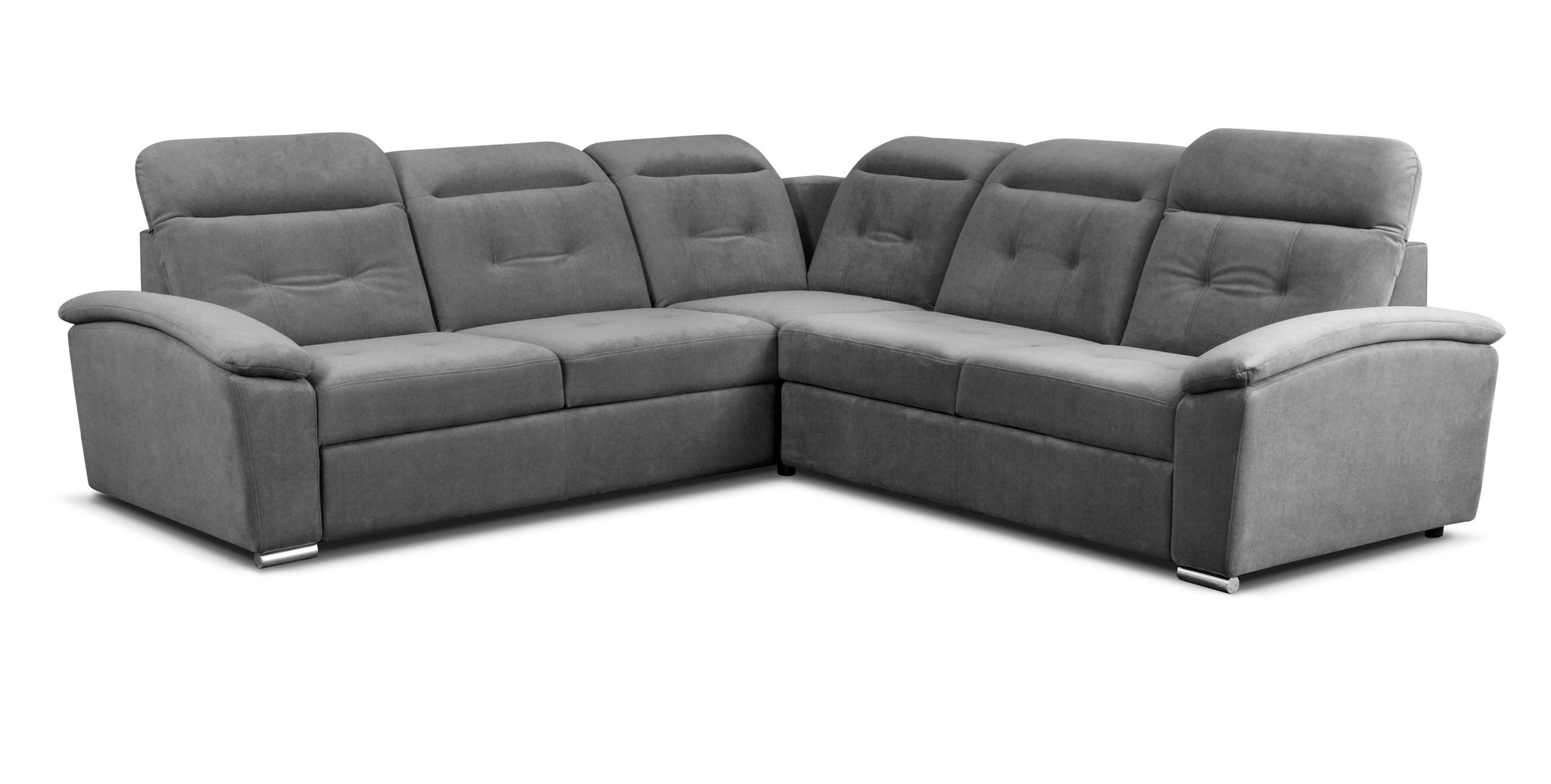 COMFORT moderní modulová rohová sedací souprava, rozkládací, pro příležitostné přespání, s úložným prostorem v OT. Výplň sedáků je tvořena kombinací pružin Faliste a PUR pěny, která zajistí pohodlné sezení. Opěrky vyplněny pěnou s vyšší elastičností. Má polohovatelné záhlavníky a chromované ozdobné nožky. Pružinová matrace. Lze volit pravé či levé provedení. Sedací souprava se vyrábí ve velkém výběru potahových látek. K sedací soupravě lze dokoupit křeslo i taburet.