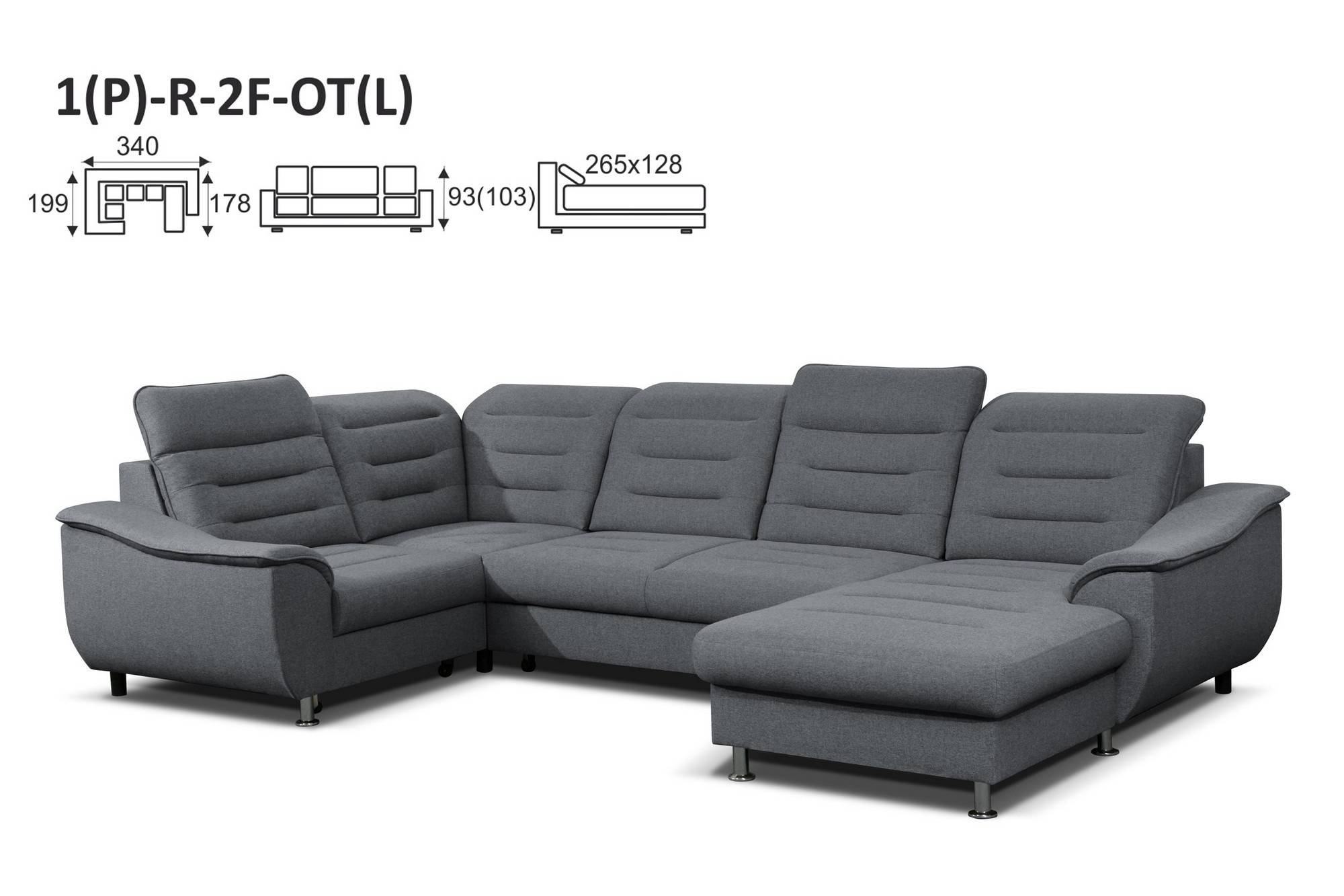 Celkový rozměry: 199 x 340 x 178 cm, v. 93-103 cm, po rozložení 265 x 128 cm