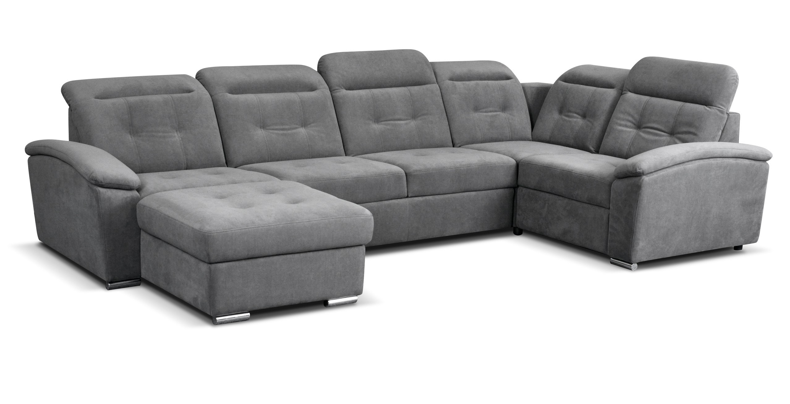 COMFORT moderní modulová sedací souprava do U, rozkládací, pro příležitostné přespání, s úložným prostorem v OT. Výplň sedáků je tvořena kombinací pružin Faliste a PUR pěny, která zajistí pohodlné sezení. Opěrky vyplněny pěnou s vyšší elastičností. Má polohovatelné záhlavníky a chromované ozdobné nožky. Pružinová matrace. Lze volit pravé či levé provedení. Sedací souprava se vyrábí ve velkém výběru potahových látek. K sedací soupravě lze dokoupit křeslo i taburet.